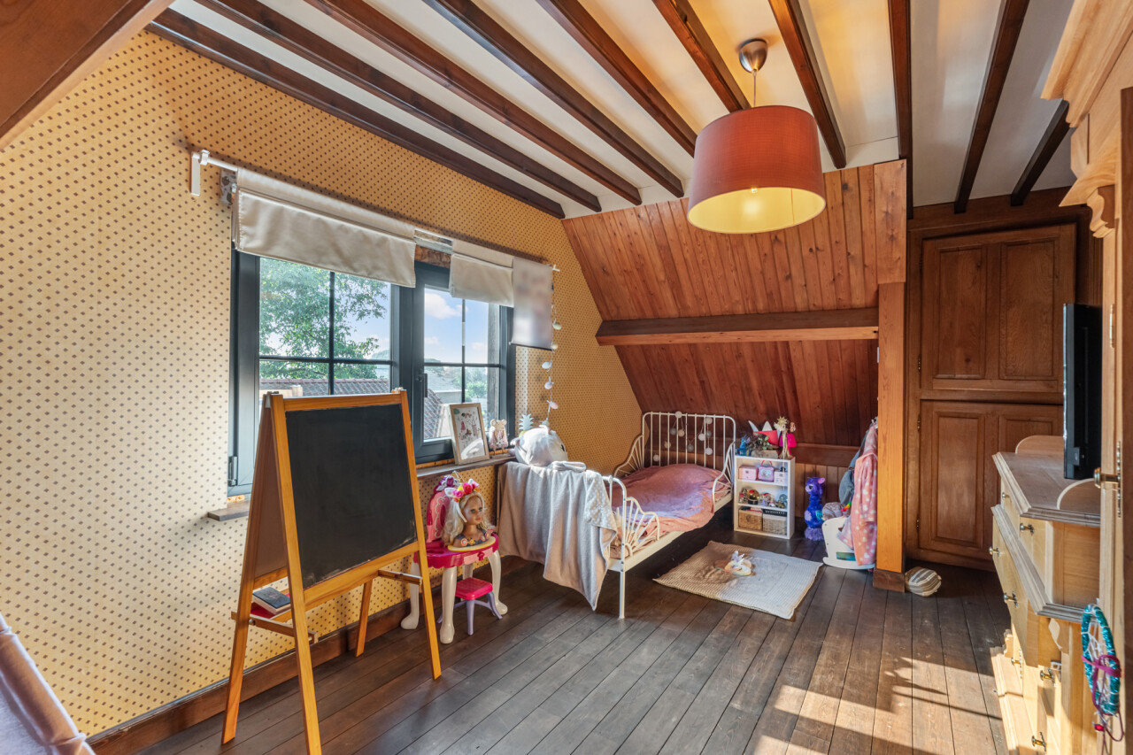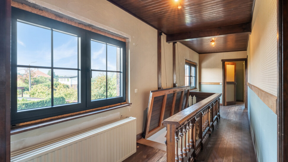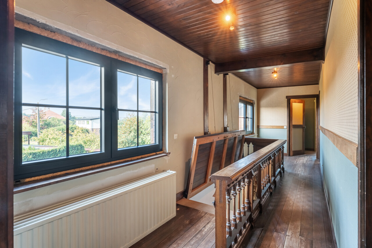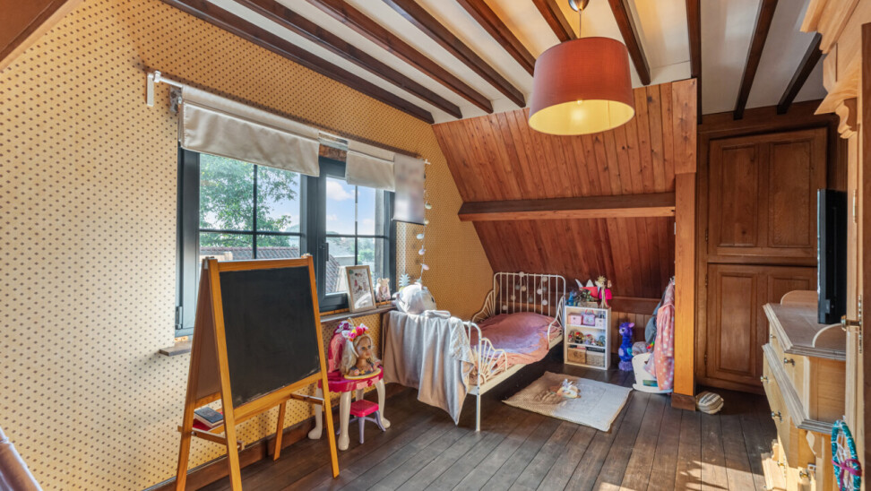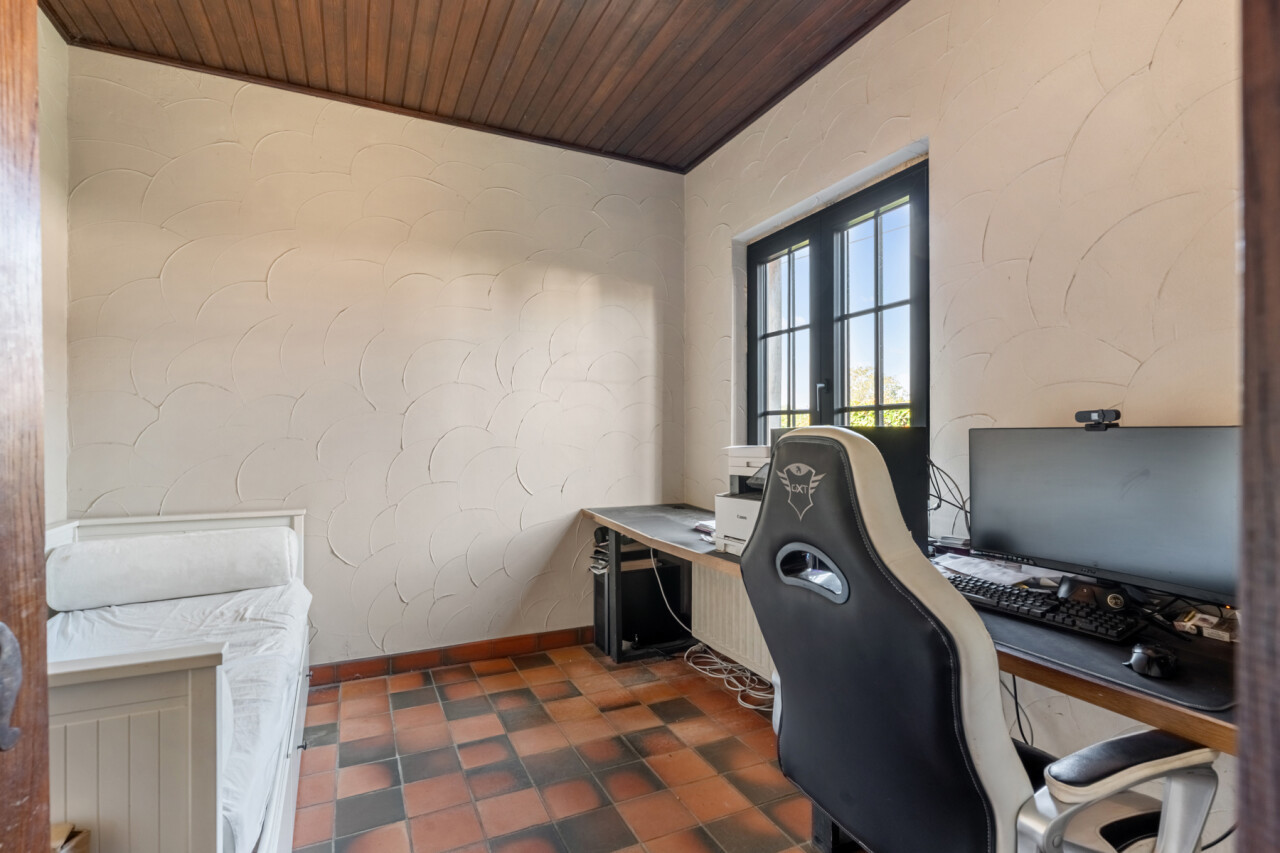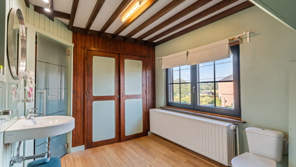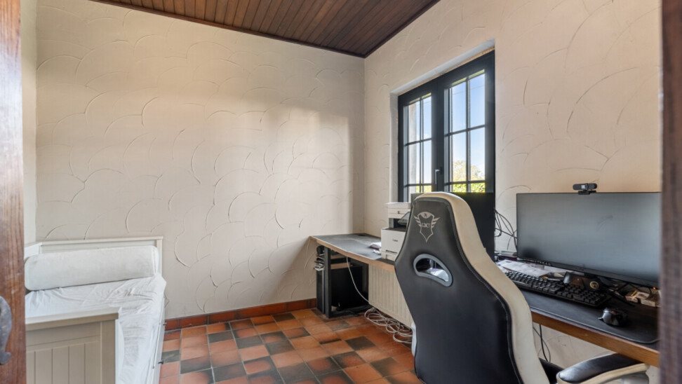 We betreden de woning via een verzorgde inkomhal met gastentoilet. De lichtrijke woonkamer werd volledig gerenoveerd en is afgewerkt met een kwalitatieve parketvloer die zorgt voor een warme, aangename sfeer. Verder op het gelijkvloers: een volledig vernieuwde keuken met hoogwaardige toestellen en een mooie veranda/leeskamer met zicht op de tuin. Er is ook een bureau die kan dienen als vierde slaapkamer.