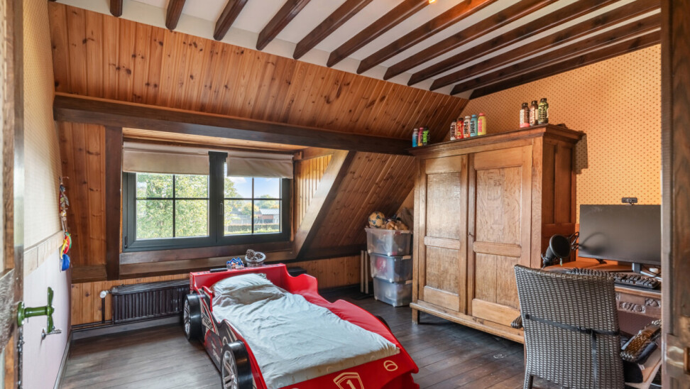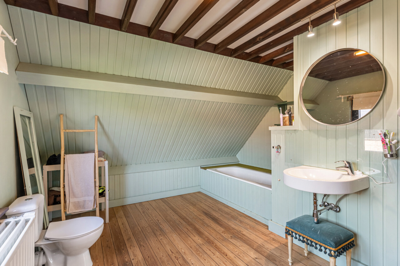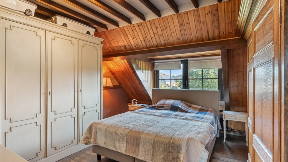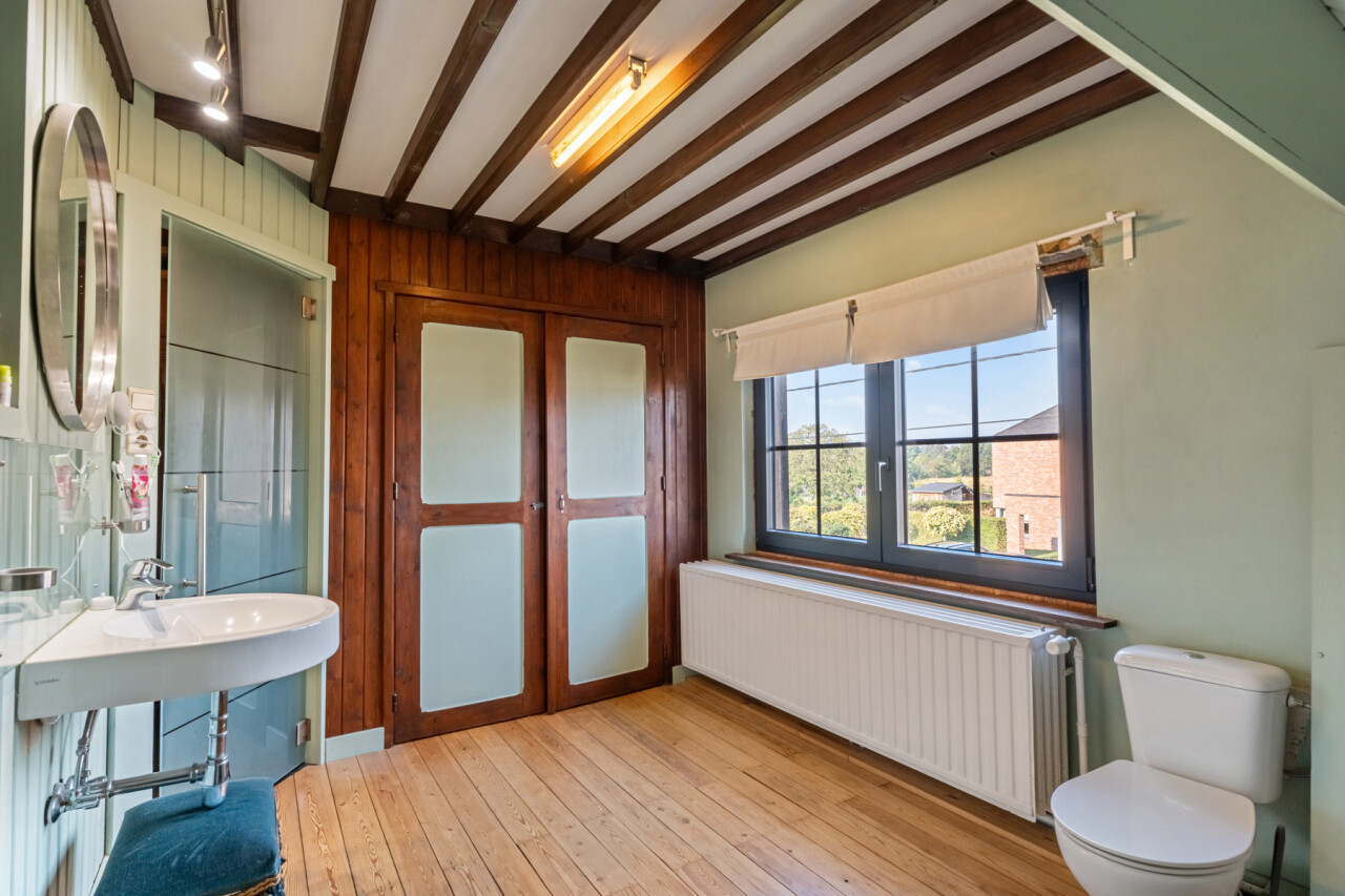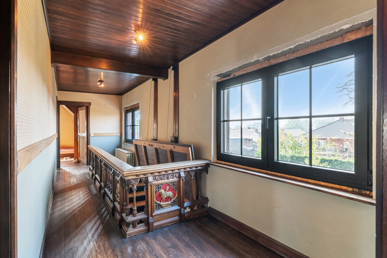 We betreden de woning via een verzorgde inkomhal met gastentoilet. De lichtrijke woonkamer werd volledig gerenoveerd en is afgewerkt met een kwalitatieve parketvloer die zorgt voor een warme, aangename sfeer. Verder op het gelijkvloers: een volledig vernieuwde keuken met hoogwaardige toestellen en een mooie veranda/leeskamer met zicht op de tuin. Er is ook een bureau die kan dienen als vierde slaapkamer.