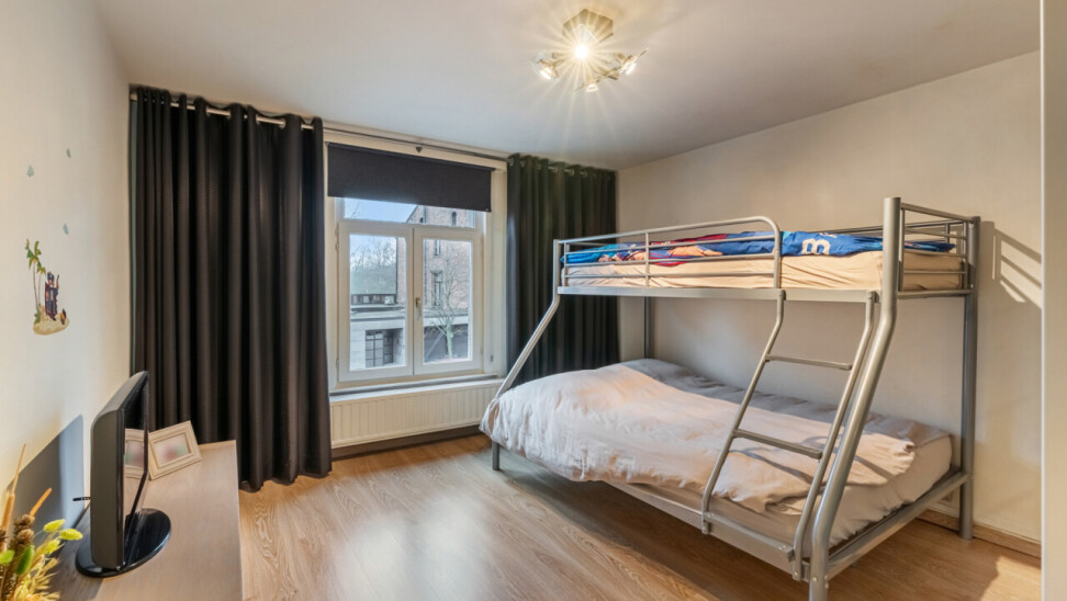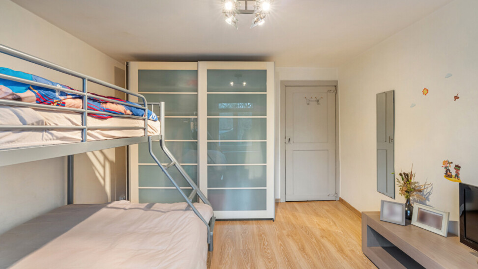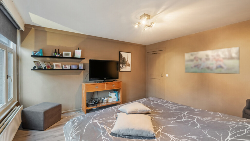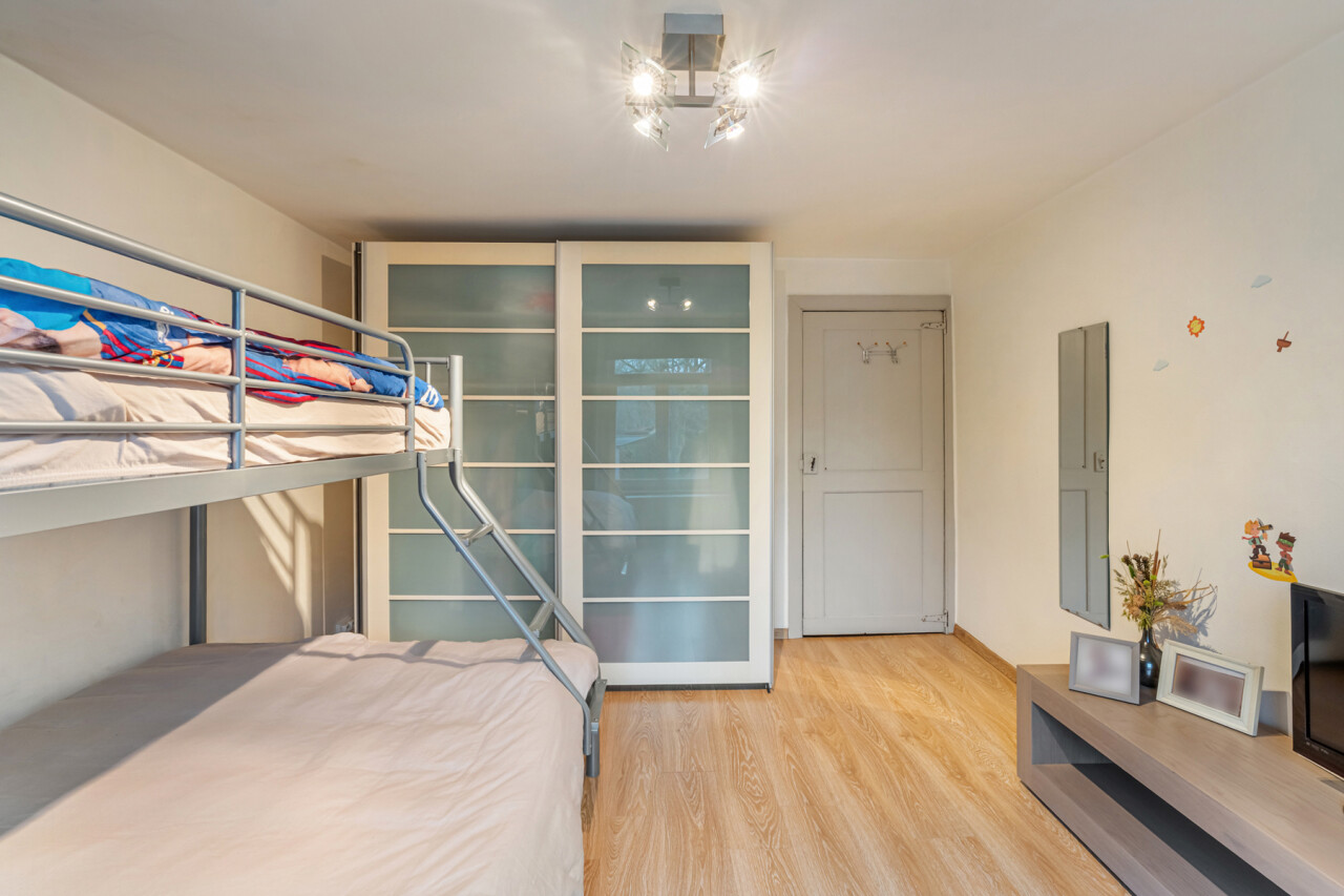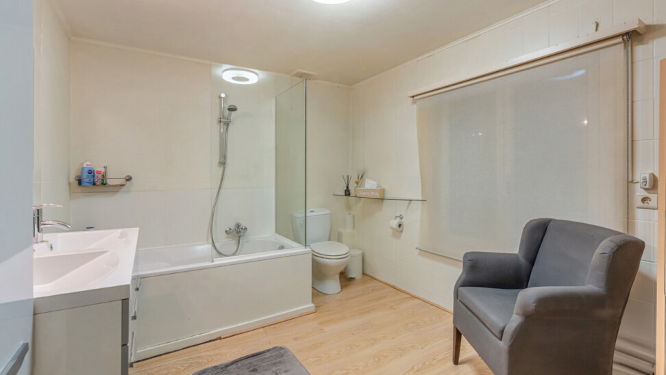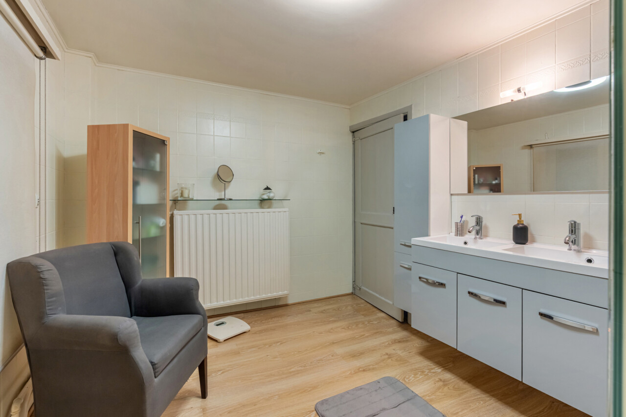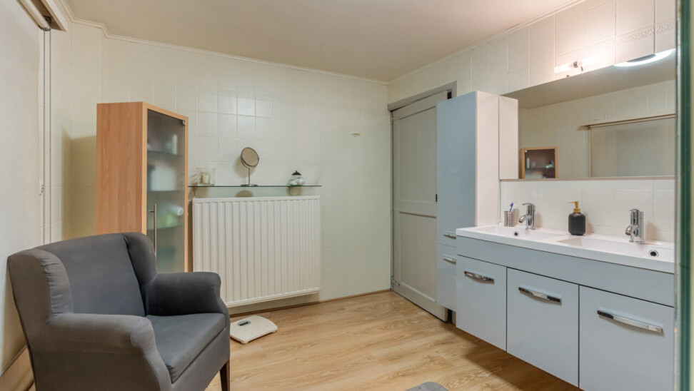 Op de eerste verdieping bevinden zich drie slaapkamers. Ook de badkamer met douche in bad, lavabomeubel en toilet is hier terug te vinden.