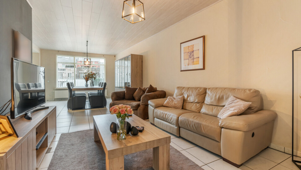Achter de winkel ligt het woongedeelte. Dit bestaat uit een inkomhal met gastentoilet en aansluitend de leefruimte met zit- en eethoek.