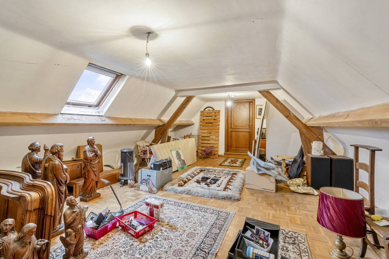 De eerste verdieping van de linkervleugel beschikt bovendien over een zolderkamer, kitchenette met aansluitend toilet en een ruime polyvalente ruimte. Momenteel is deze ingericht als atelier, maar ze kan perfect dienen als bv. leefruimte.
