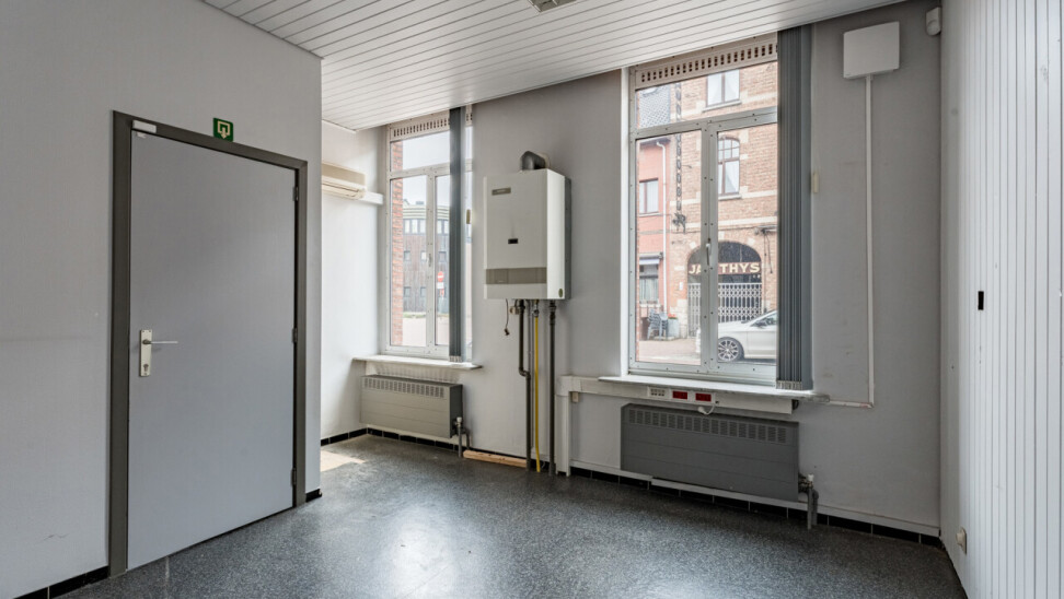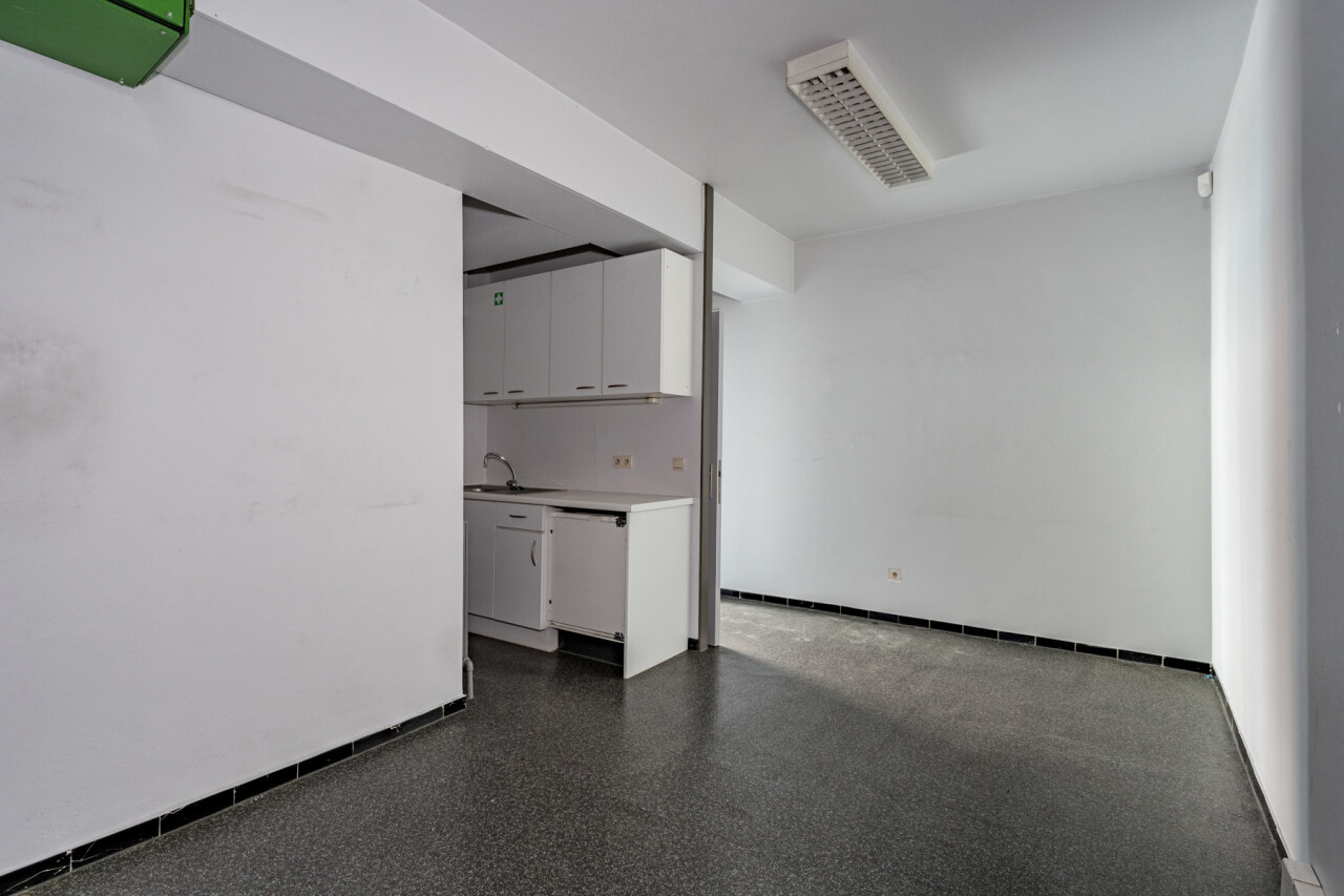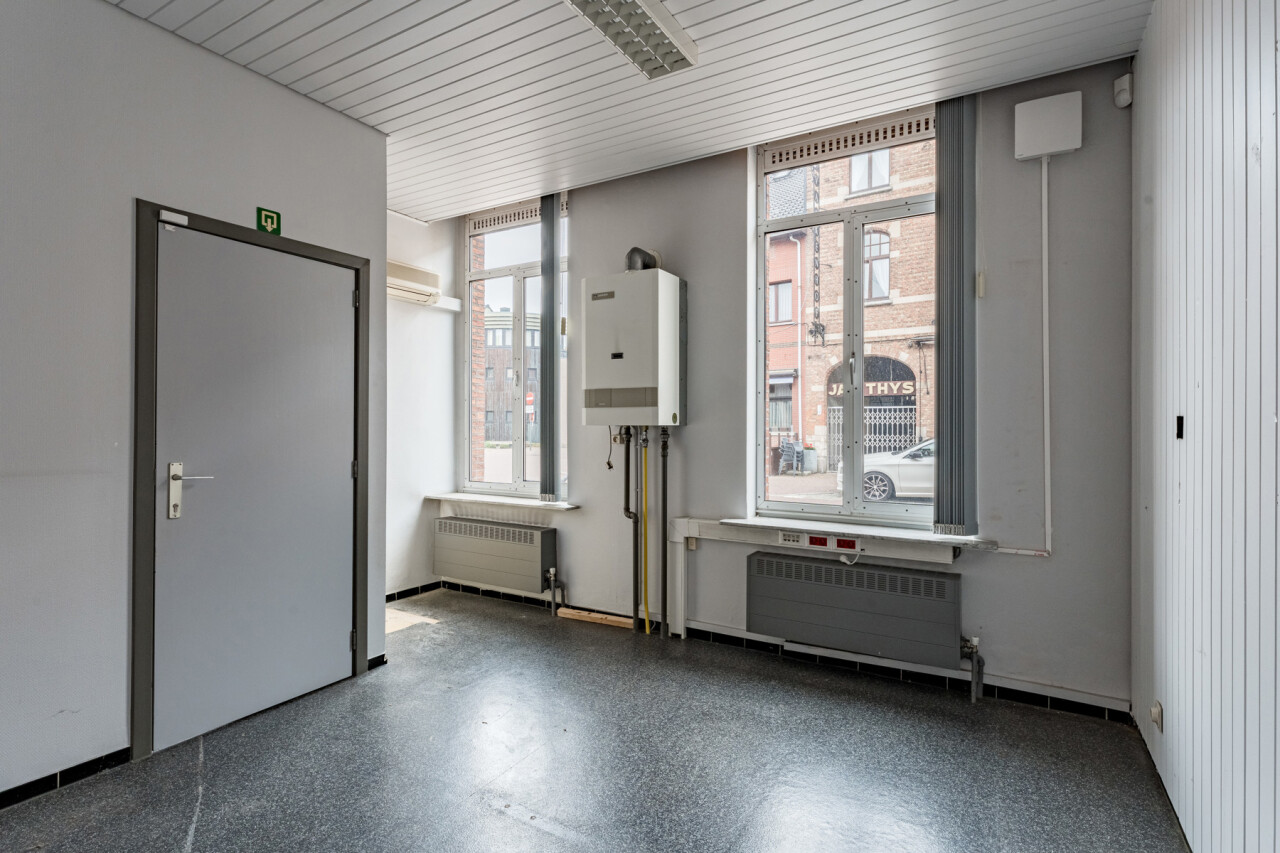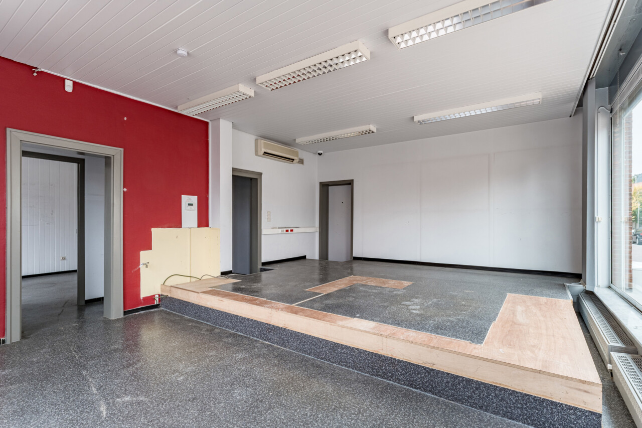 Het gelijkvloers vraagt een opfrissing, maar biedt hierdoor net de mogelijkheid om het volledig naar eigen smaak en professionele noden in te richten. De commerciële ruimte is praktisch ingedeeld en beschikt over een toog, keukenruimte, berging en toegang tot een kelder.