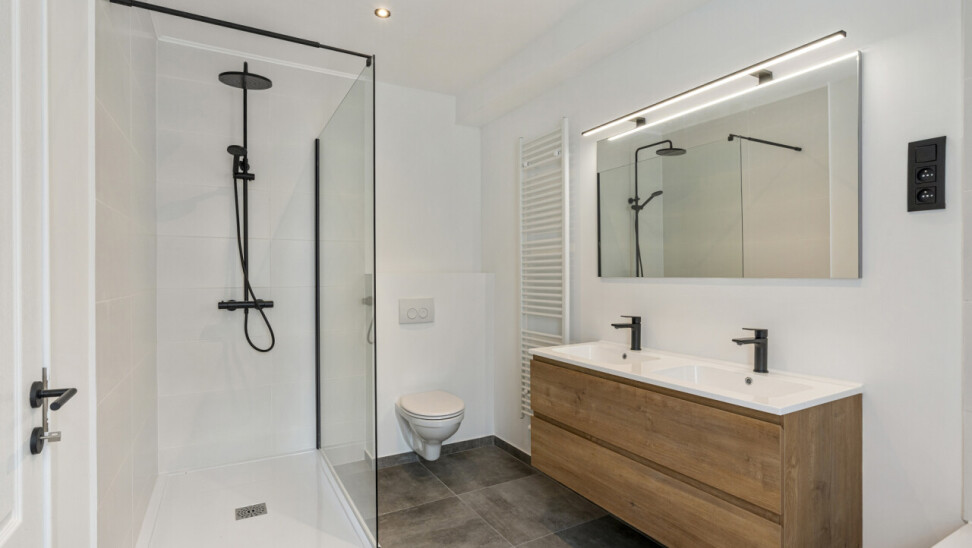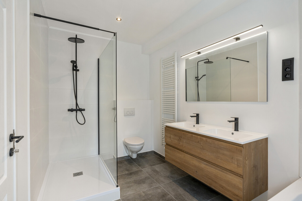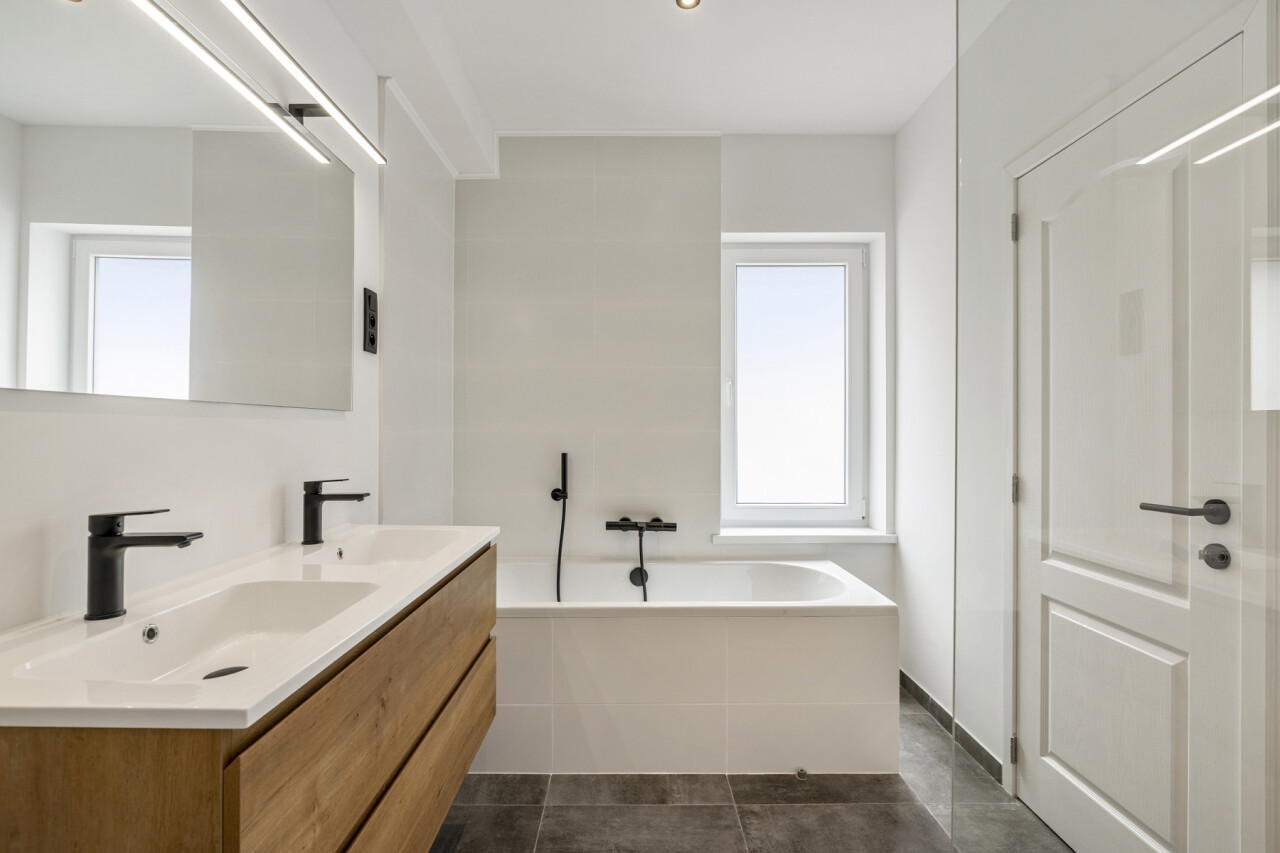 Eerste verdieping: Stijlvolle badkamer met elegante zwarte kranen, een praktische wasplaats en een royale slaapkamer. Vanuit de overloop heb je directe toegang tot het zonnige dakterras, perfect om te ontspannen.