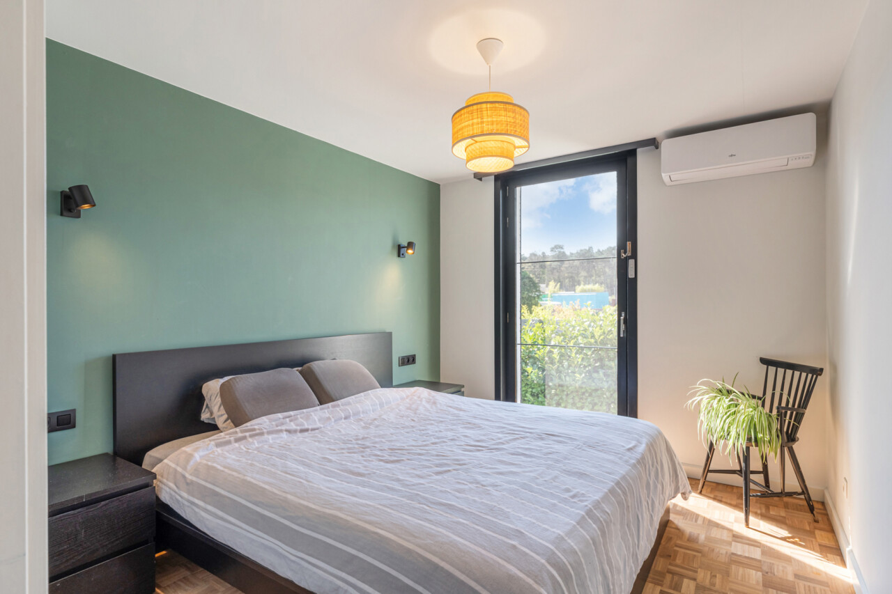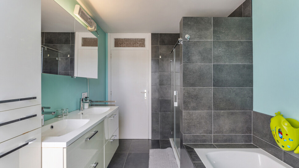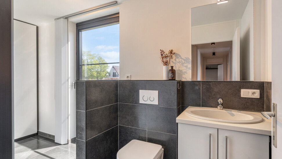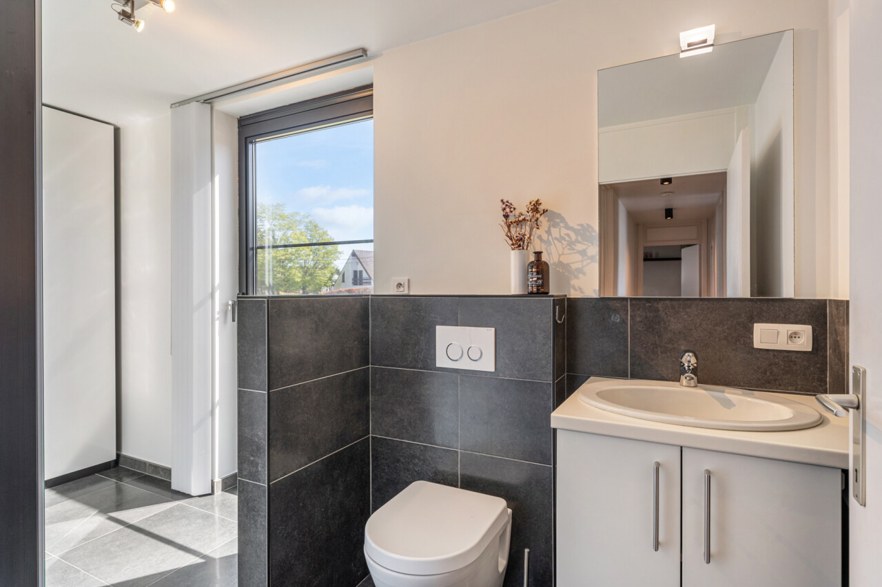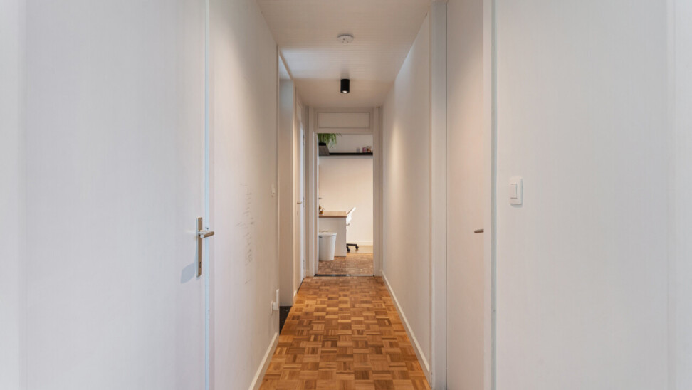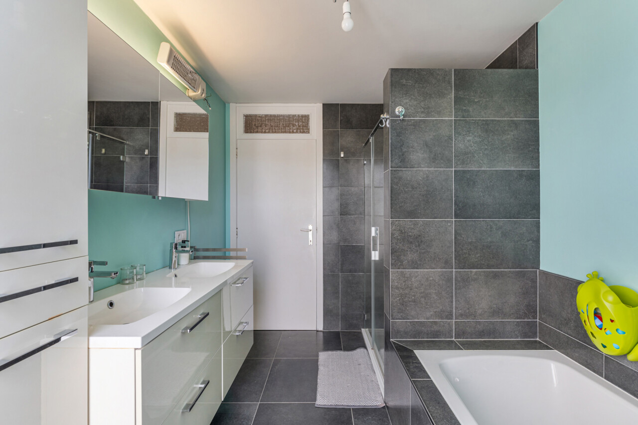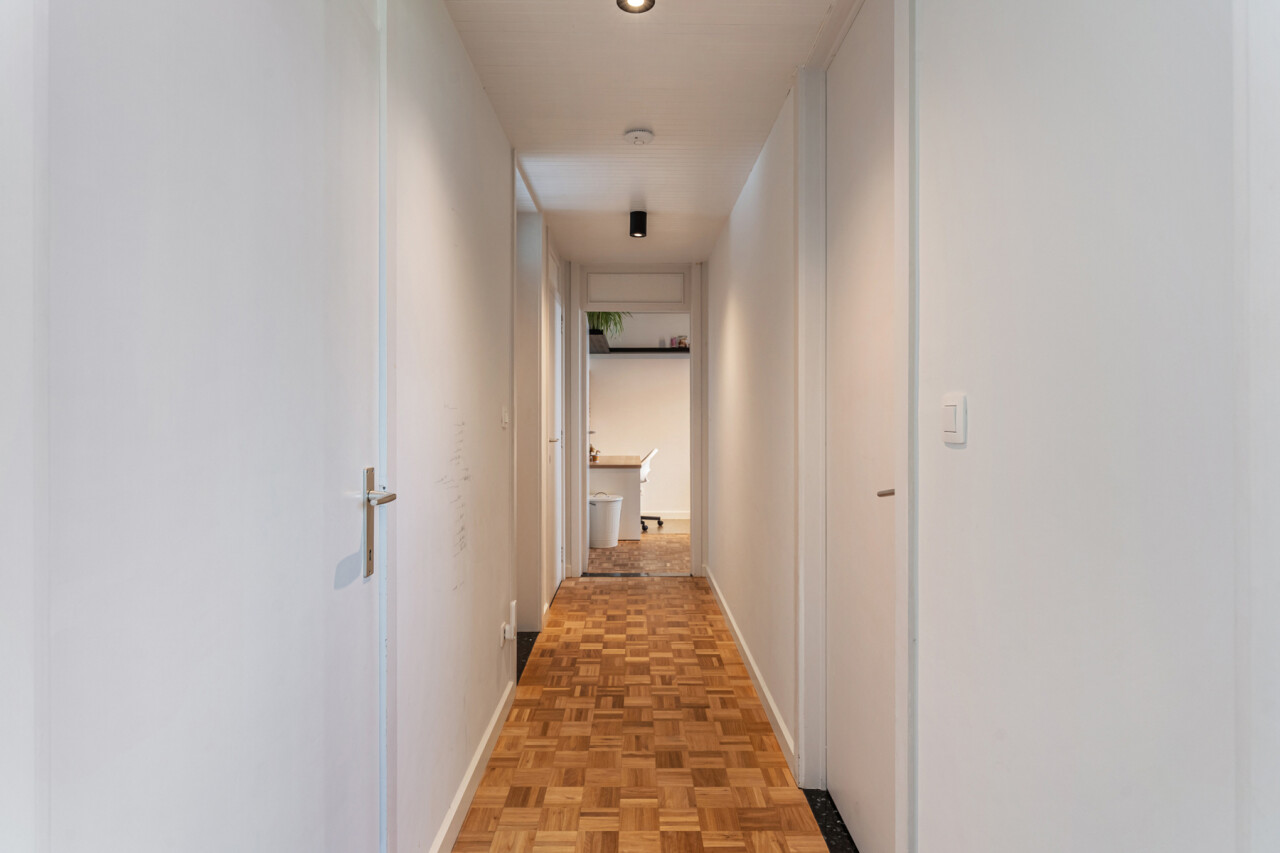 Vanuit de zithoek is er toegang naar de nachthal waar we het prachtige, originele blokjesparket terugvinden. Deze biedt aansluiting met de 3 ruime slaapkamers alsook het toilet. De badkamer is uitgerust met douche, ligbad, en dubbel lavabomeubel en maakt de woning compleet.