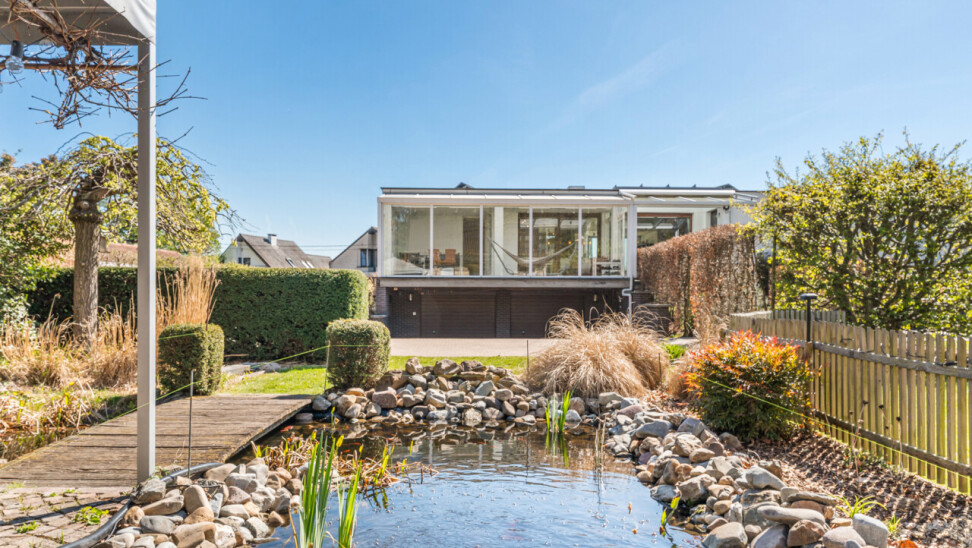 Indeling: -1: kelder met dubbele inpandige garage glv: inkomhal met toilet, leefruimte met zithoek, bureau/speelhoek en eetkamer, keuken, berging, veranda, nachthal, 3 slaapkamers, badkamer, toilet met dressing buiten: aangelegde tuin met vijver en terrassen