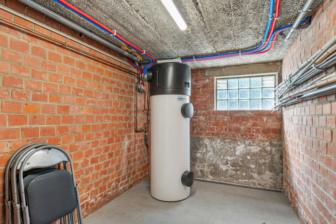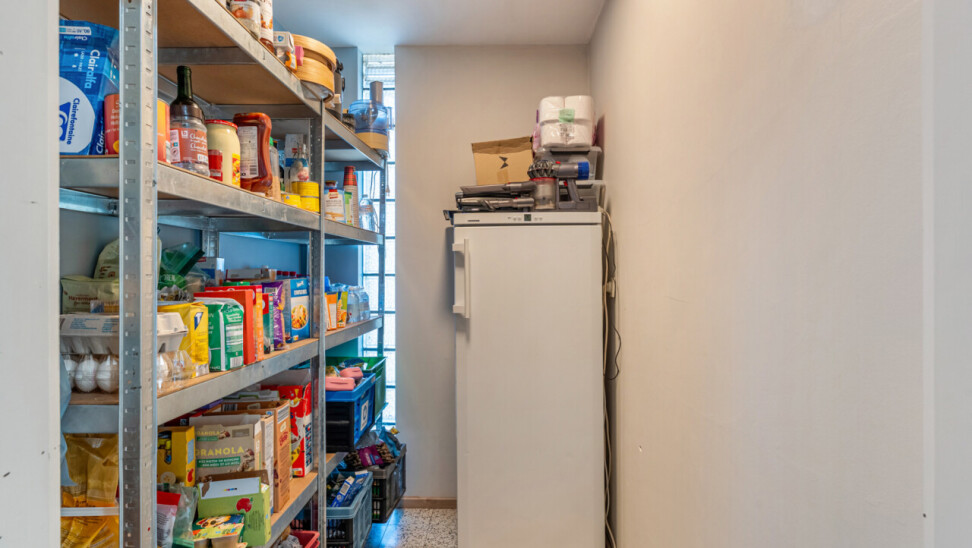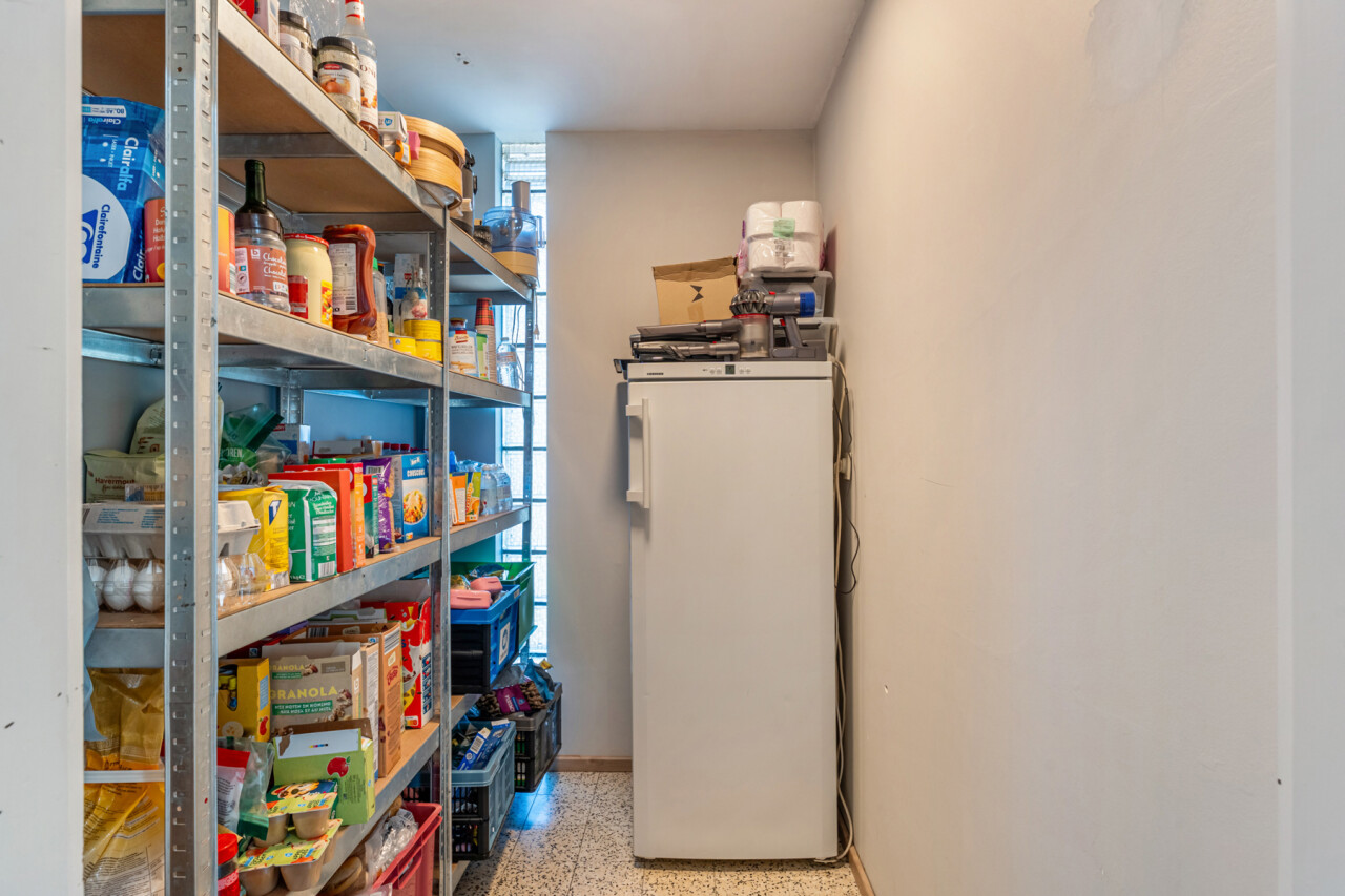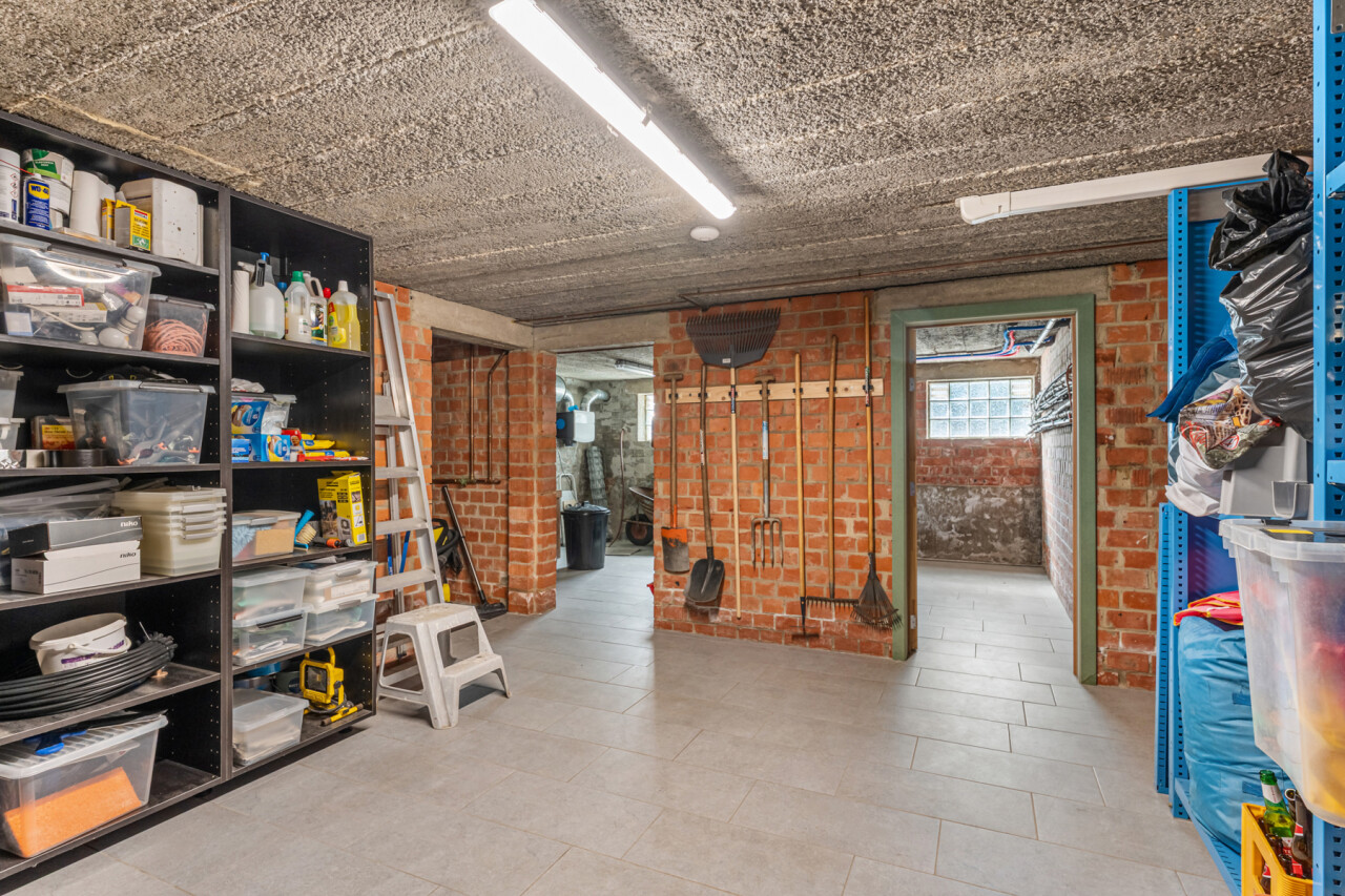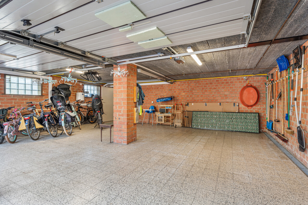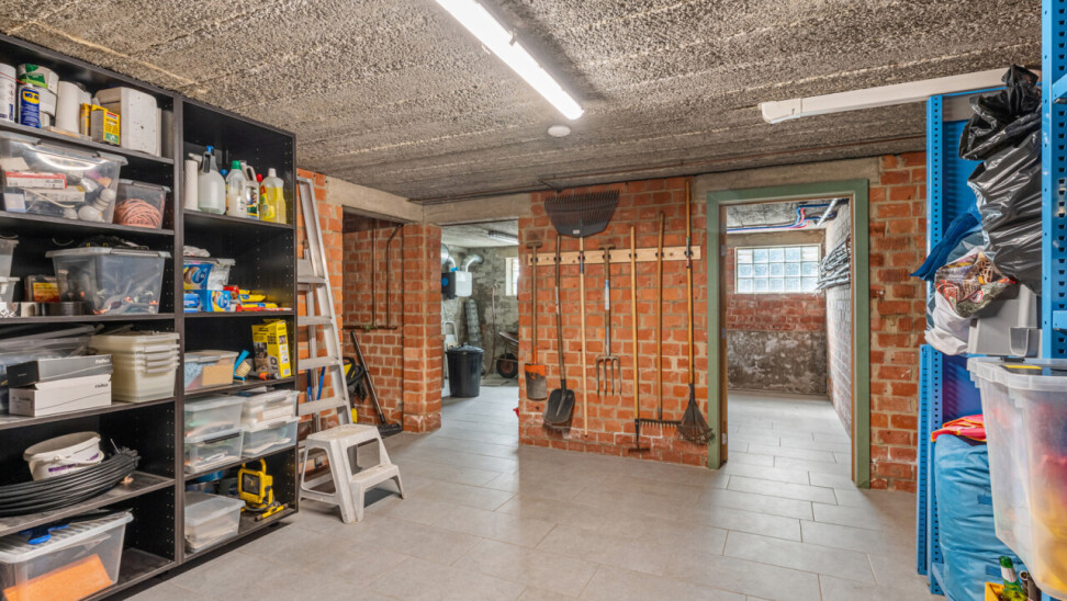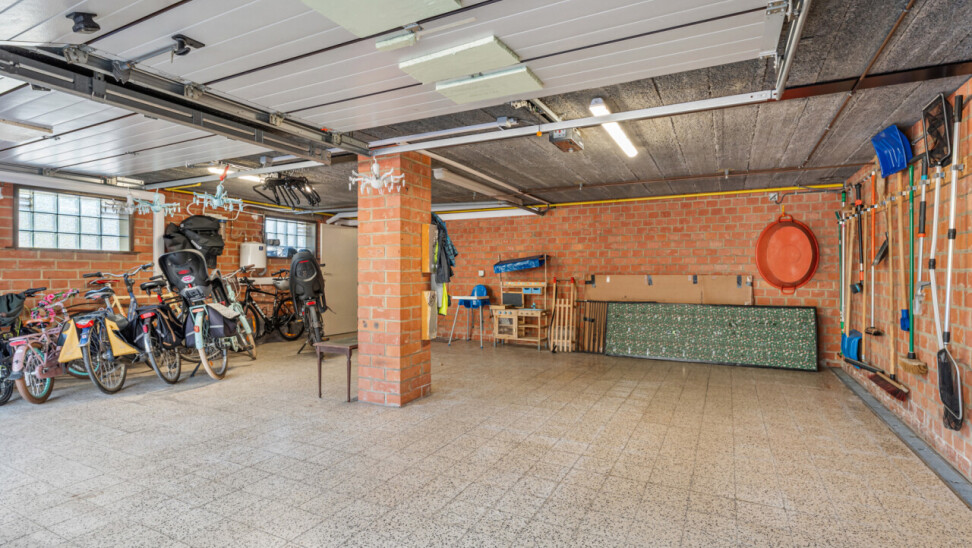 De zeer ruime kelder van 205m² beschikt over een dubbele garage en voorziet in de nodige ruimte voor opslag. De inrit maakt dat de garage ook met fietsen, grasmaaier, werkgerief,... makkelijk toegankelijk is.