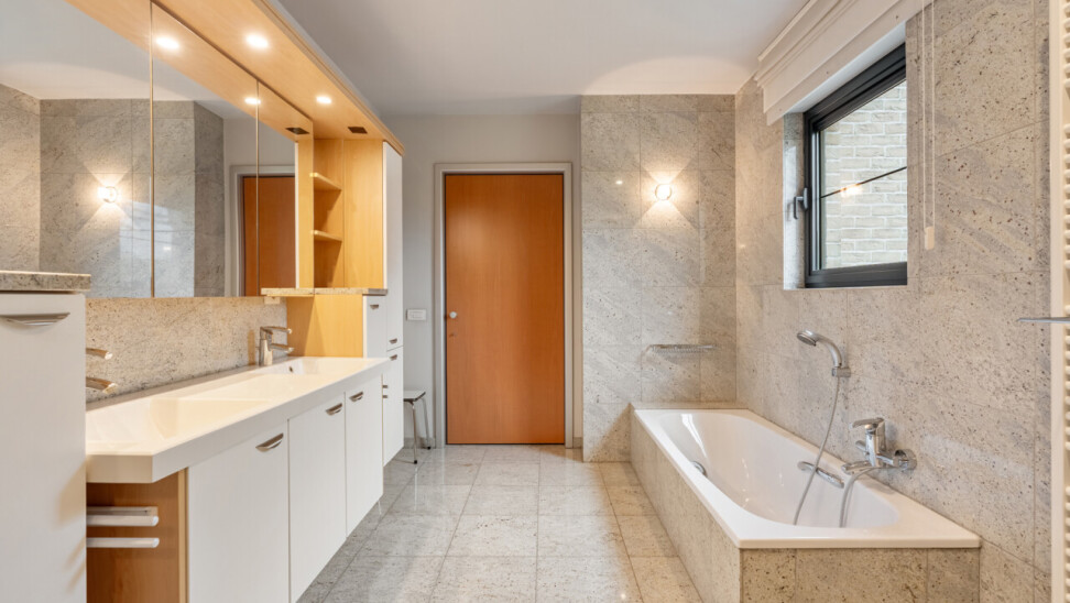 Op het gelijkvloers bevindt zich eveneens een badkamer, en ook op de bovenverdieping is een tweede badkamer voorzien, wat het comfort aanzienlijk verhoogt.