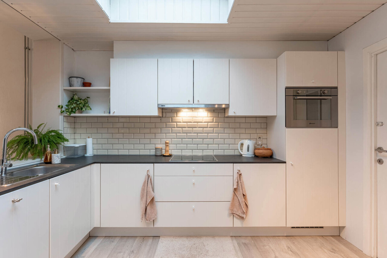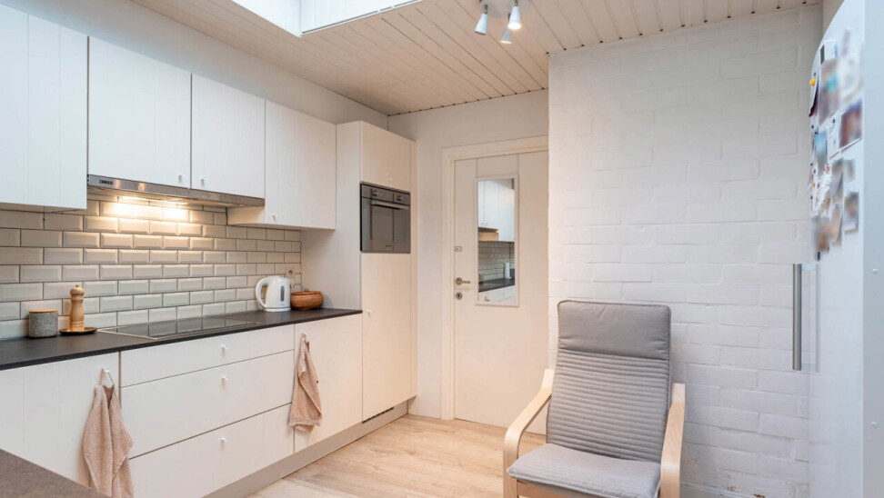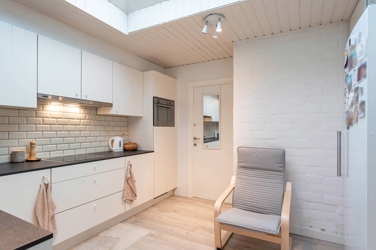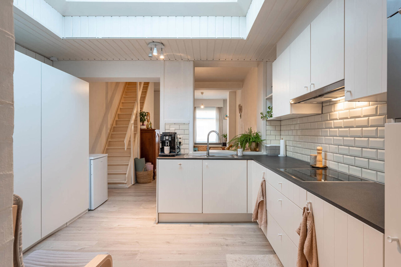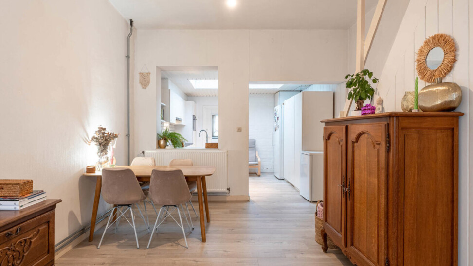 We betreden de woning via een handige inkomhal met ruimte voor bijvoorbeeld schoenen en jassen. Aansluitend bevindt zich de leefruimte met zit- en eetgedeelte, die op hun beurt een aangename connectie vormen met de keuken. Deze werd volledig vernieuwd in 2016 en beschikt over de nodige hedendaagse toestellen.