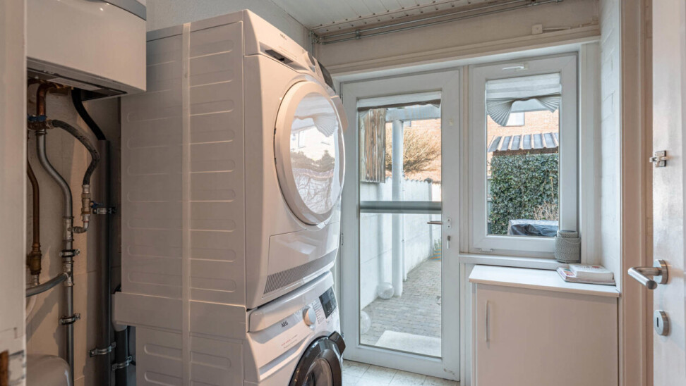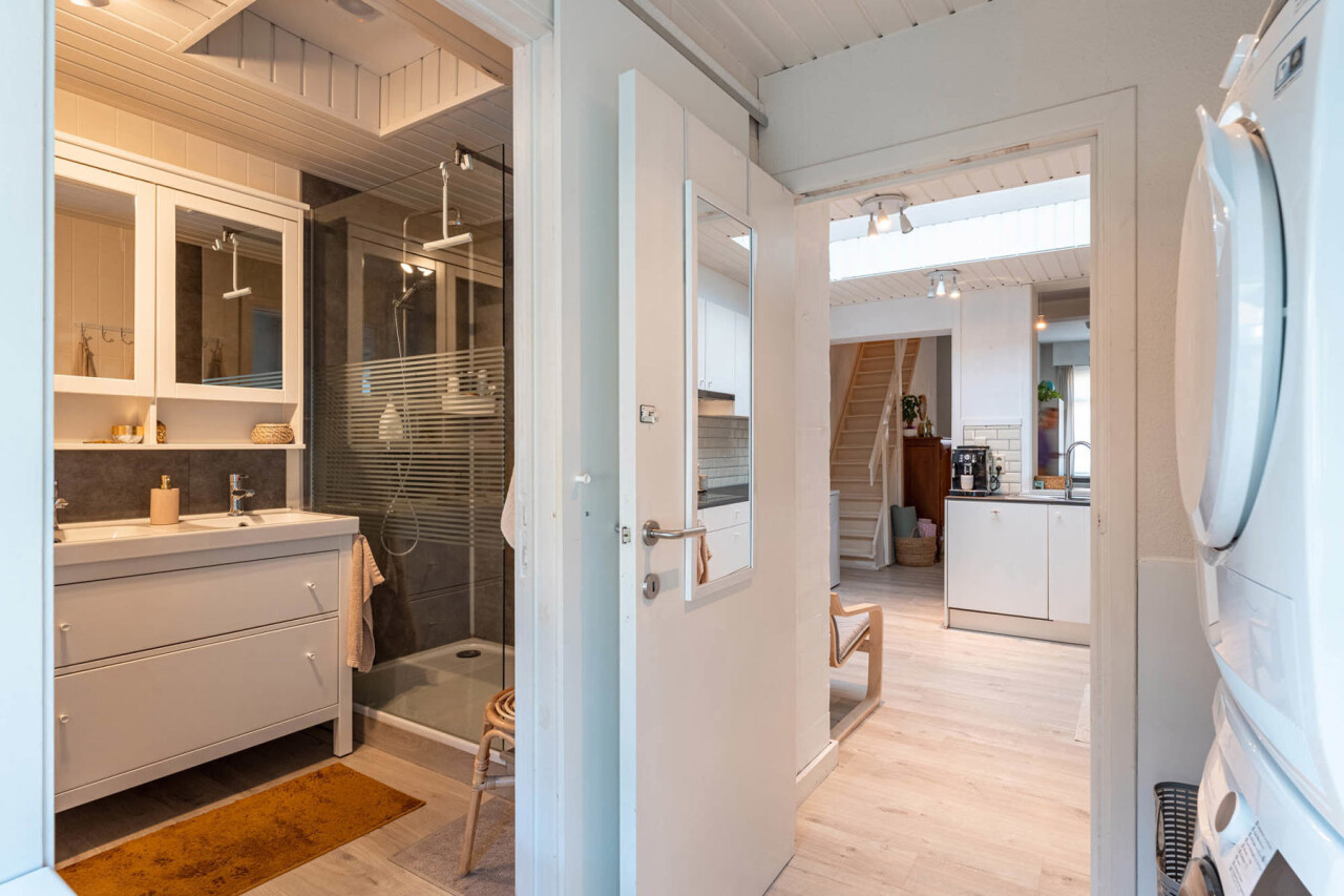 Achter de keuken is er de technische ruimte/wasplaats, met aansluitend de badkamer. Deze is uitgerust met een douche, dubbel lavabomeubel en toilet.