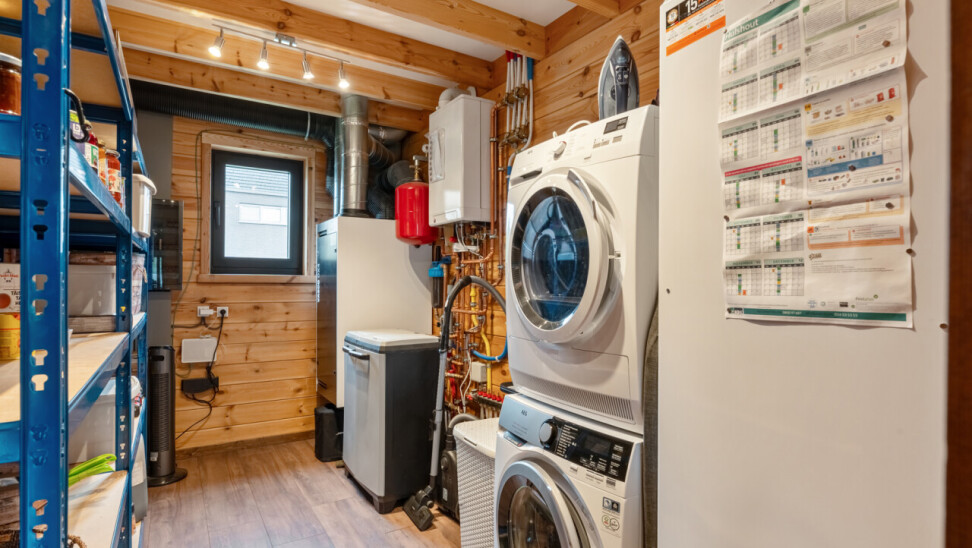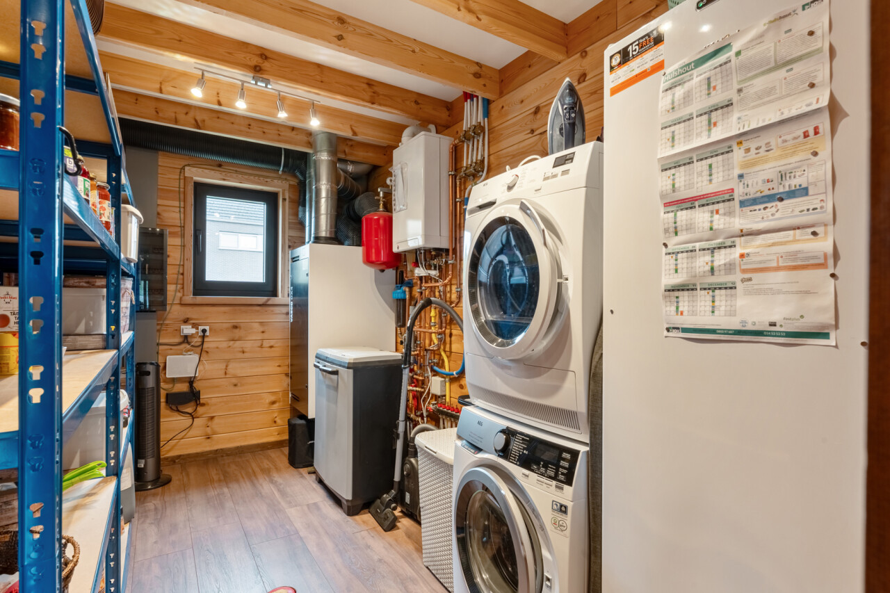 Inkomhal met gastentoilet. Lichtrijke leefruimte met open keuken, uitgerust met inductiekookplaat, combi-oven, vaatwasser, koelkast en spoelbak. Aansluitende ruime berging met voorzieningen voor wasmachine en droogkast.