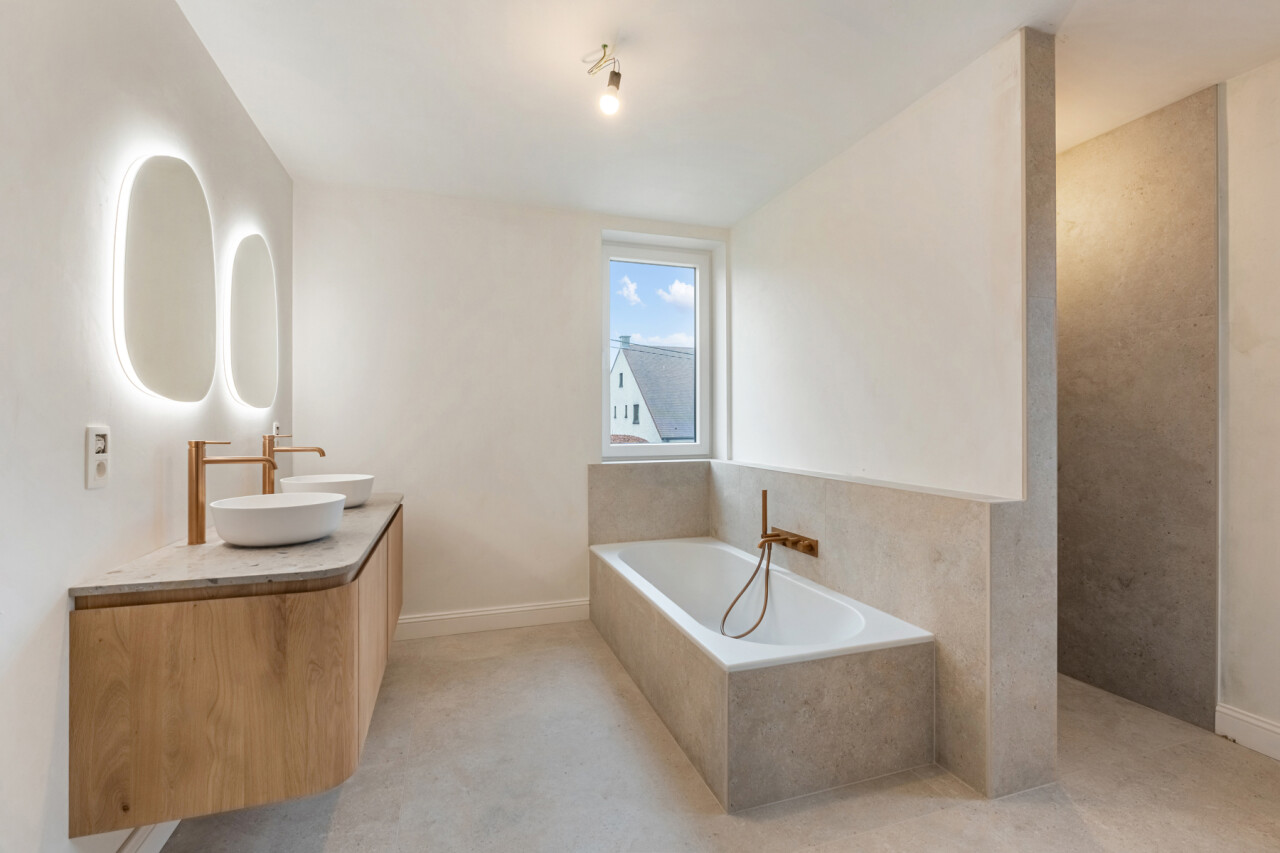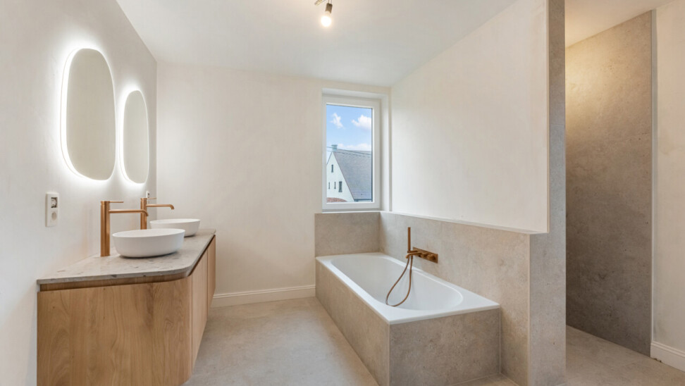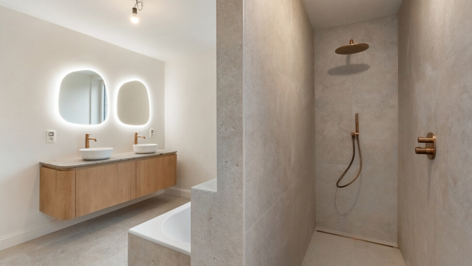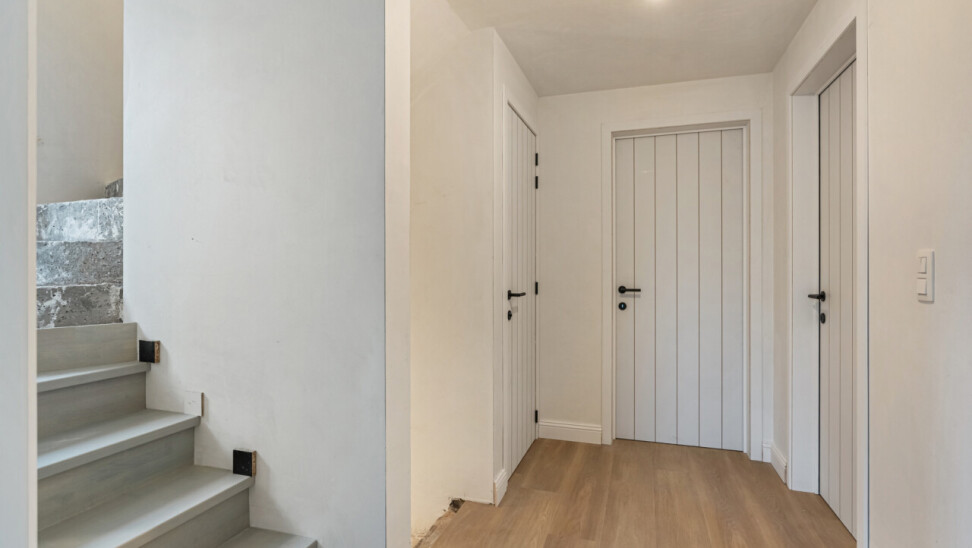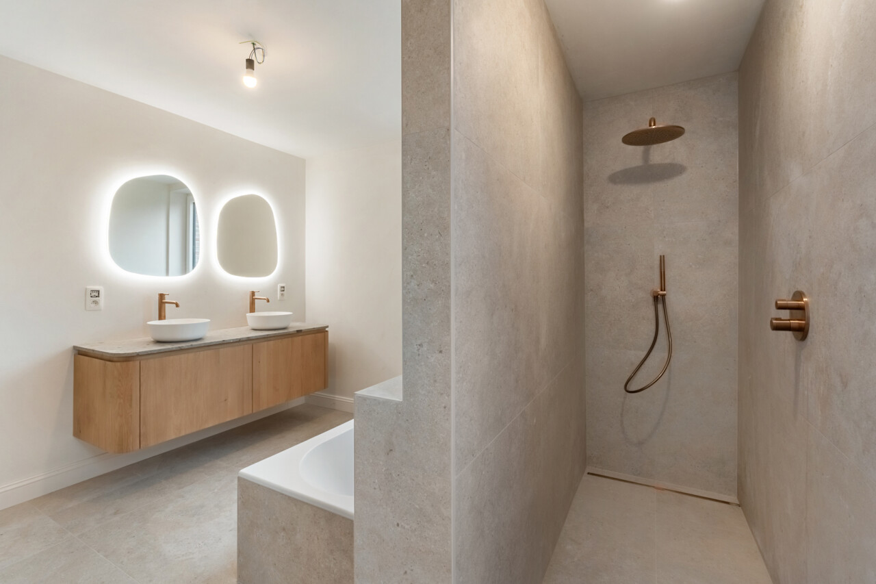 De eerste verdieping omvat drie prachtige slaapkamers en een luxueuze badkamer uitgerust met een inloopdouche én ligbad, volledig afgewerkt met kwalitatieve materialen voor een moderne en harmonieuze uitstraling.