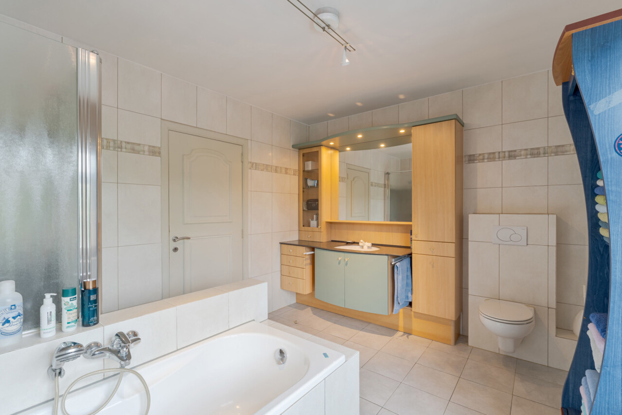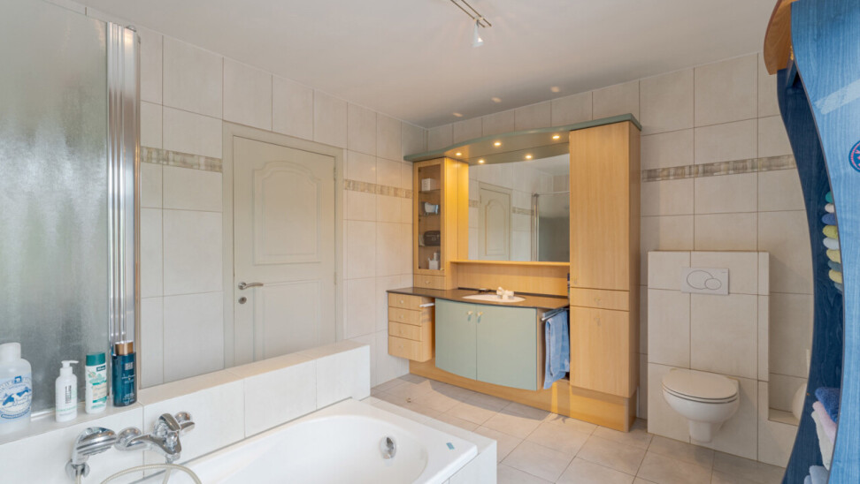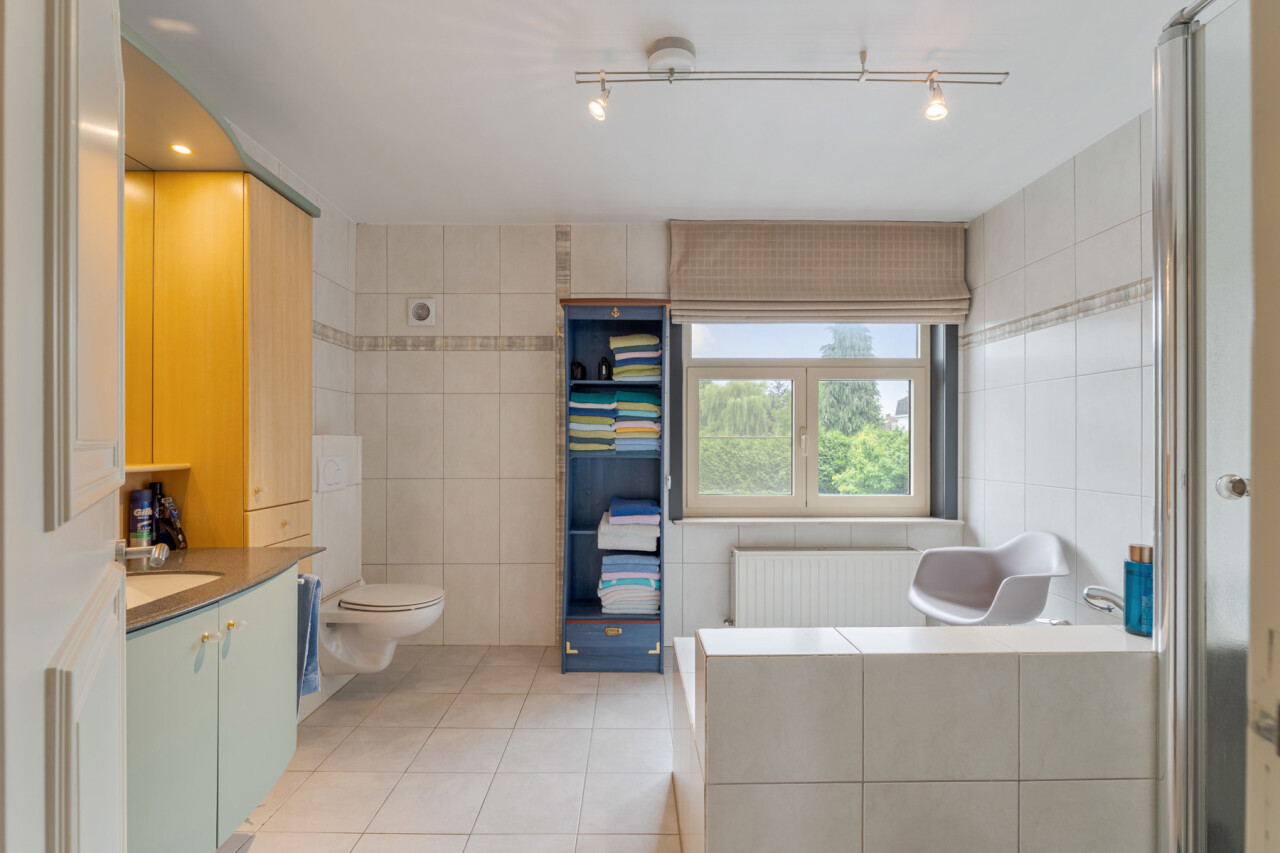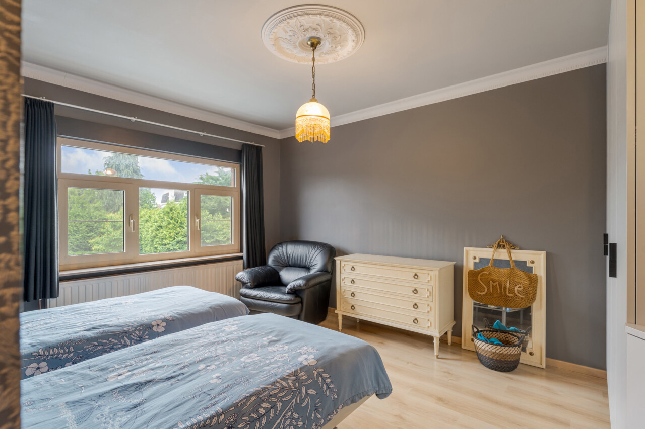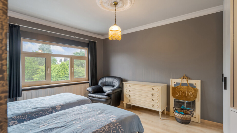 Op de 1ste verdieping vinden we 2 ruime slaapkamers (beide 24 m²) met de mogelijkheid om één op te splitsen zodat er een derde slaapkamer wordt gecreëerd. De badkamer is voorzien van ligbad, douche, lavabomeubel en een toilet. De woning is voorzien van zowel een zeer praktische kelder en zeer ruime zolder.