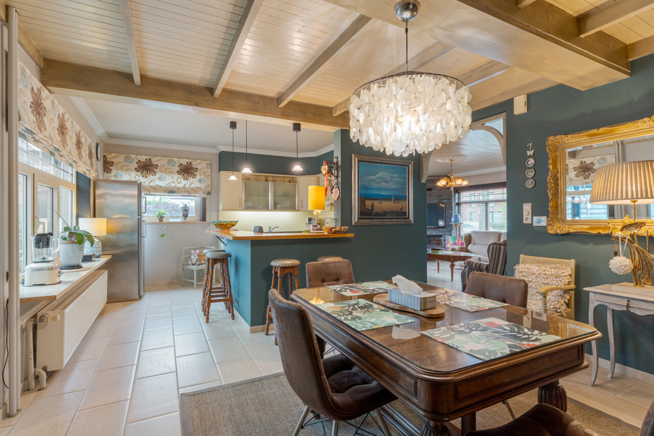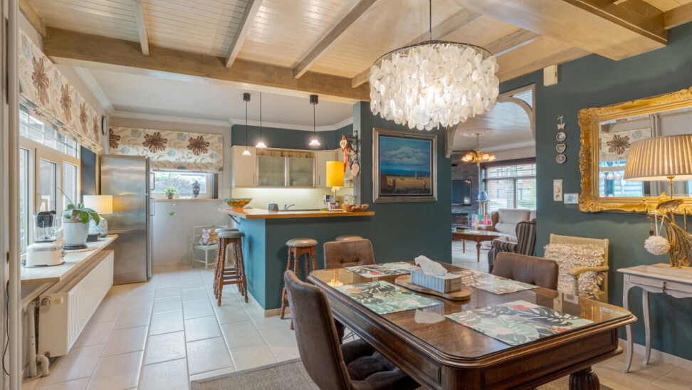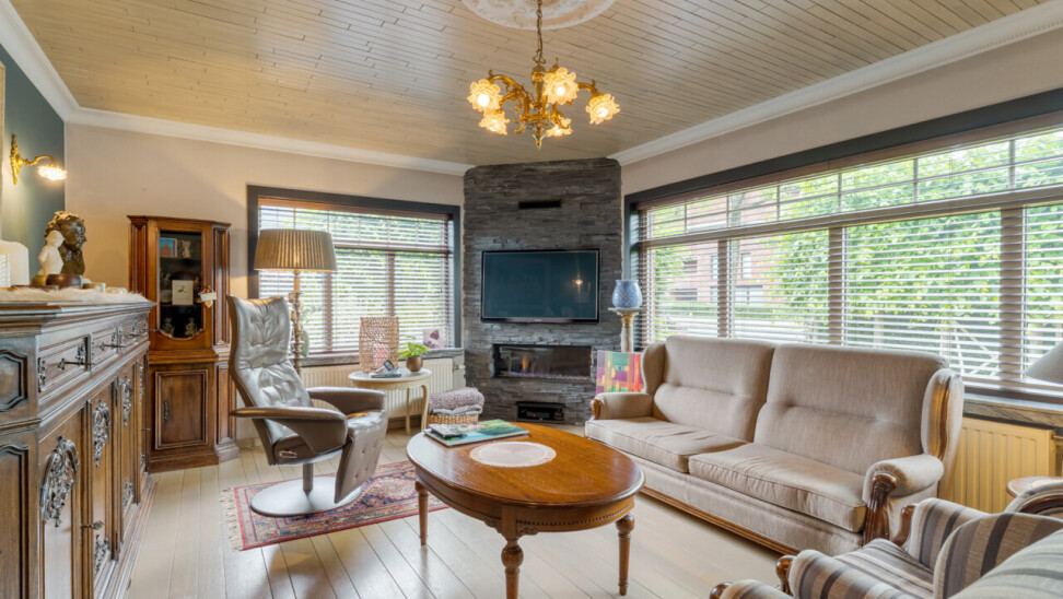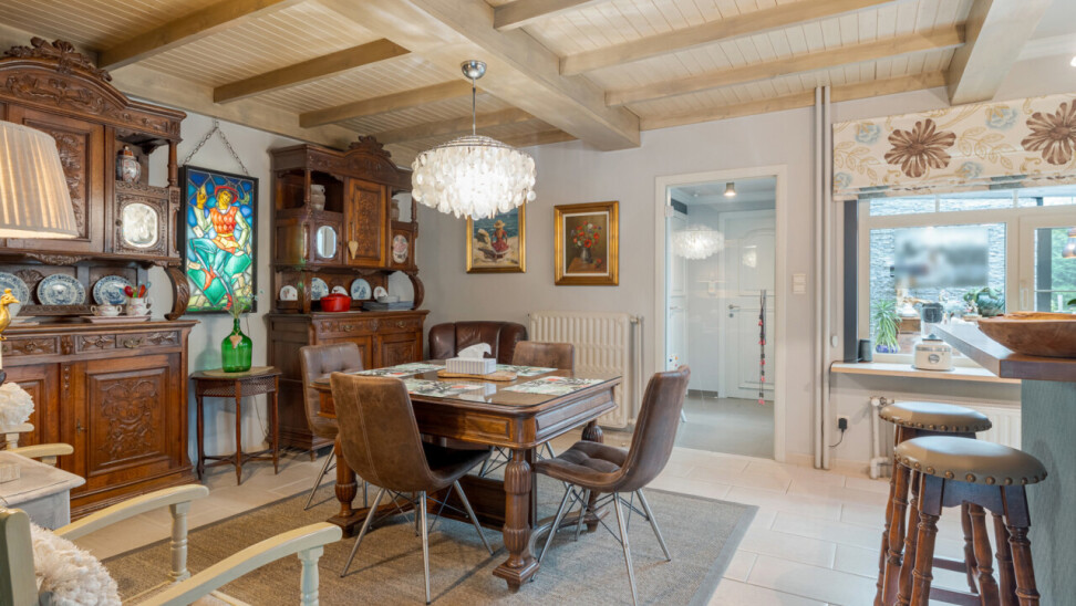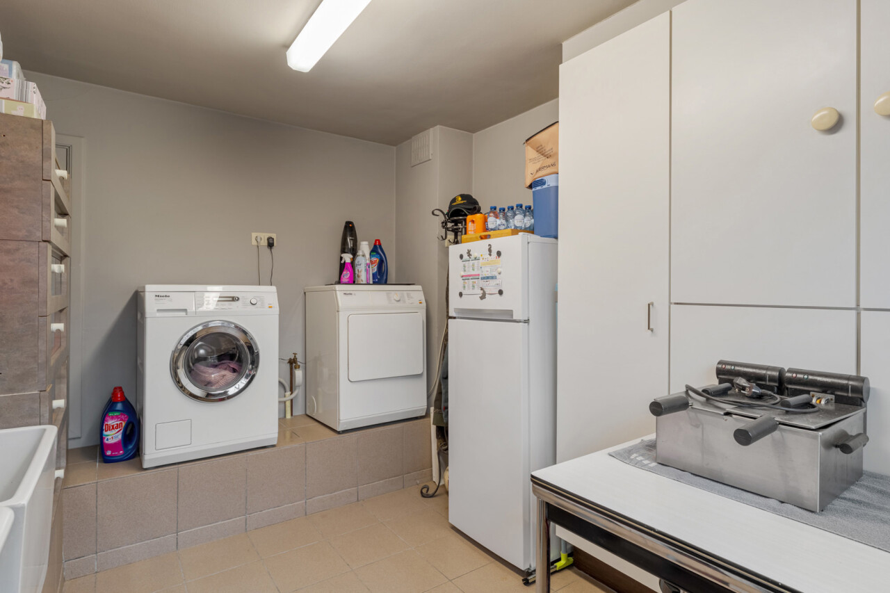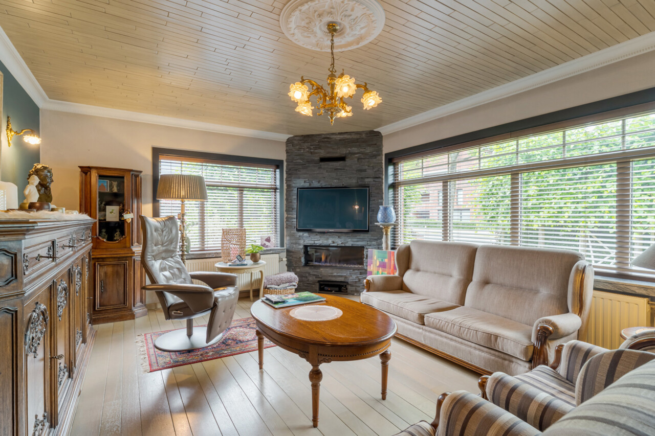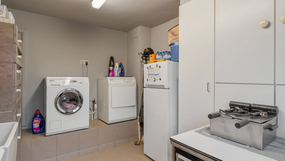 Via de inkomhal is er toegang naar de bijzonder gezellige woonkamer (24 m²) met gashaard. Aansluitend aan de woonkamer is er de volledig geïnstalleerde halfopen leefkeuken (31 m²). Zeer praktisch is de grote aansluitende berging/wasplaats met ingemaakte kasten en verhoog voor was-en droogkast.