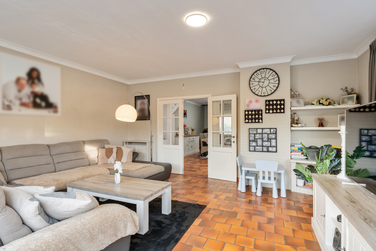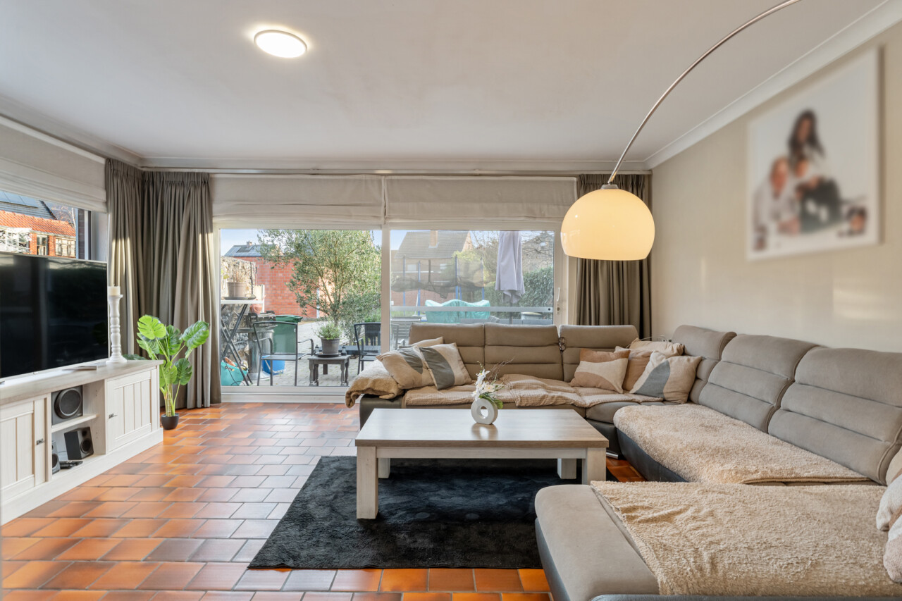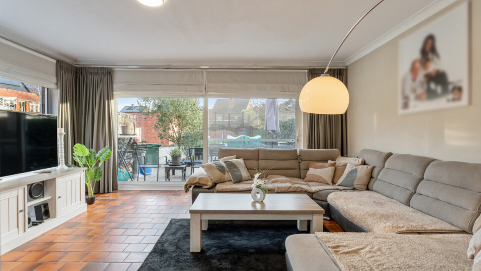 De zithoek bevindt zich achteraan de woning en van hieruit kijk je uit over de tuin dankzij een grote schuifraam over de hele breedte van de achtergevel. Ook een toilet is aanwezig op het gelijkvloers.