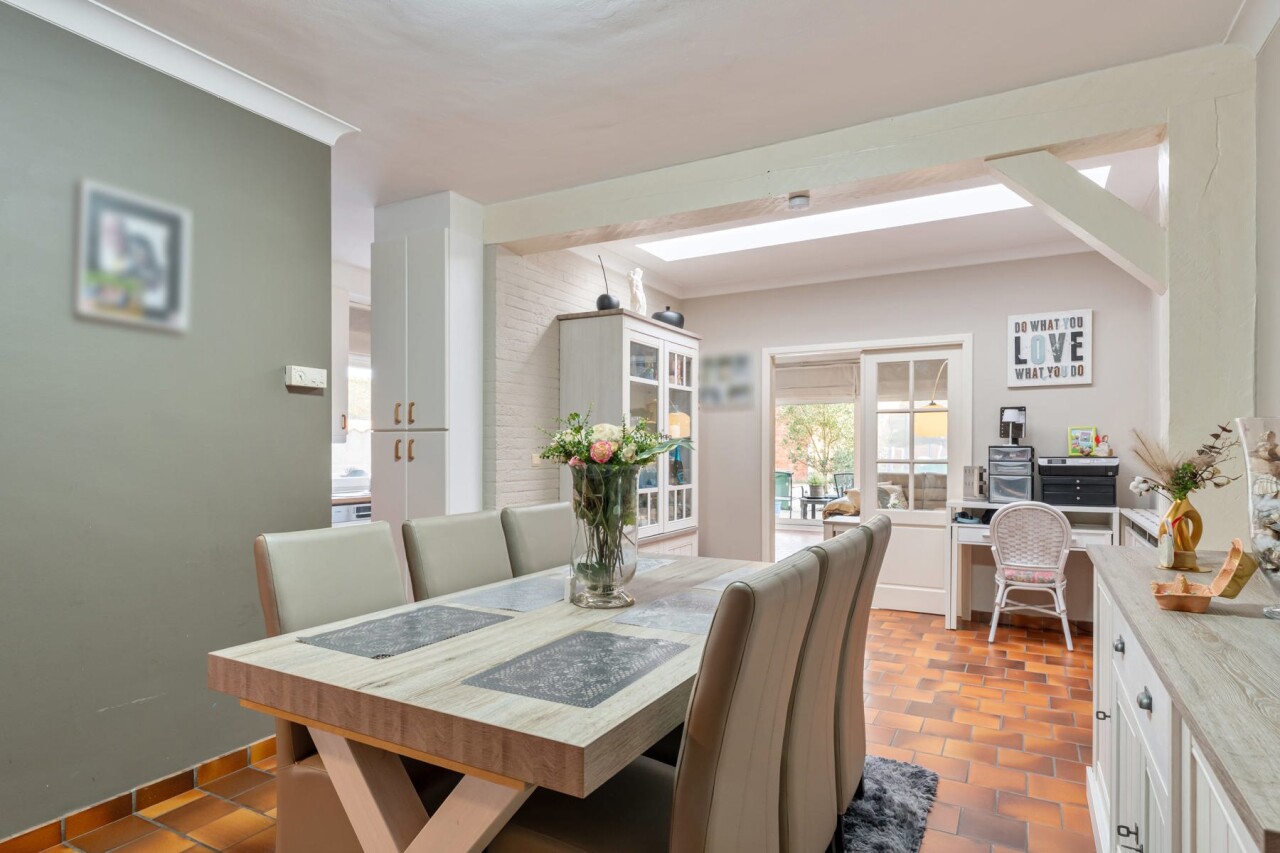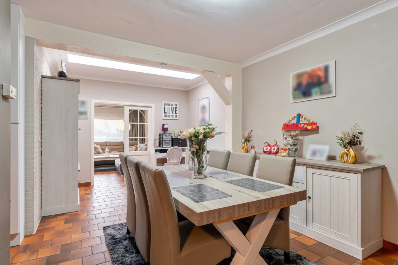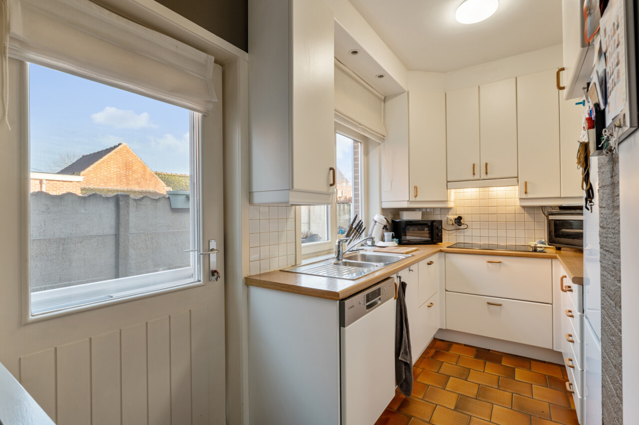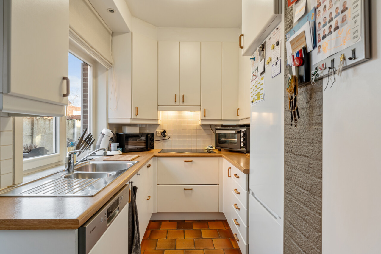 De eetplaats zit centraal in de woning en heeft aansluiting met de keuken en zithoek. De keuken is compact en voorzien van een grote raam voor de nodige lichtinval. De nodige toestellen zoals vaatwasmachine zijn aanwezig.