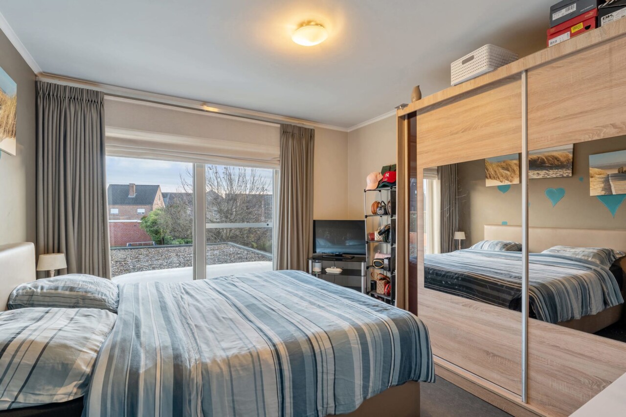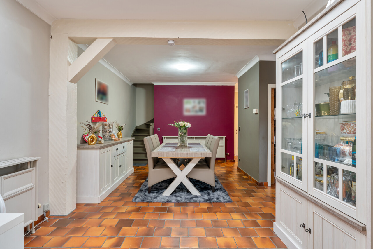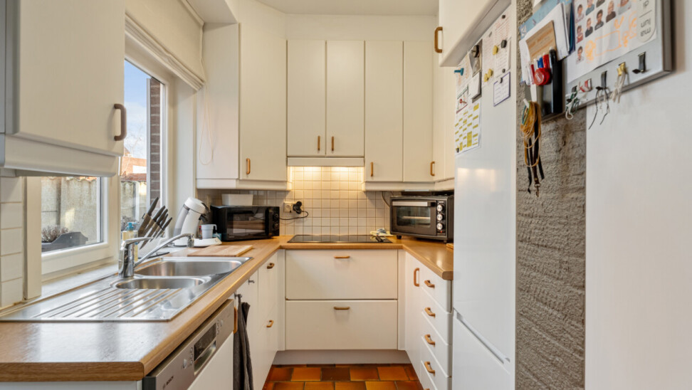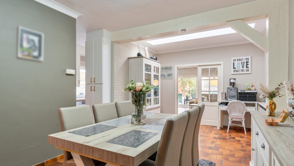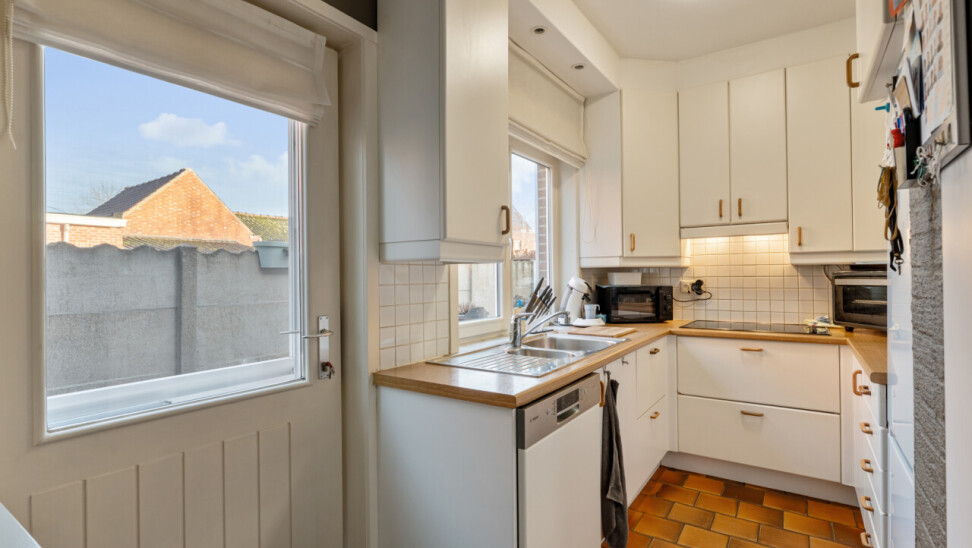 De eetplaats zit centraal in de woning en heeft aansluiting met de keuken en zithoek. De keuken is compact en voorzien van een grote raam voor de nodige lichtinval. De nodige toestellen zoals vaatwasmachine zijn aanwezig.
