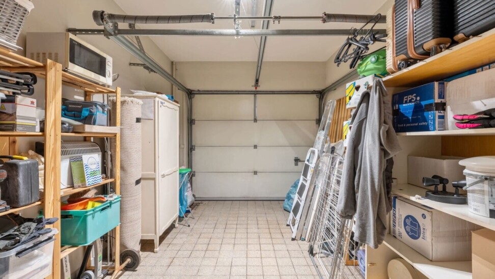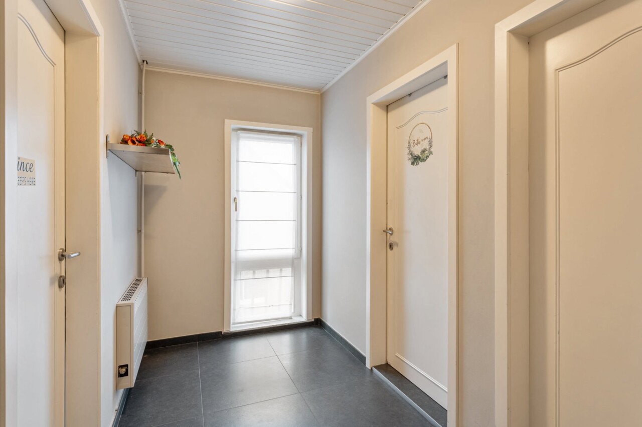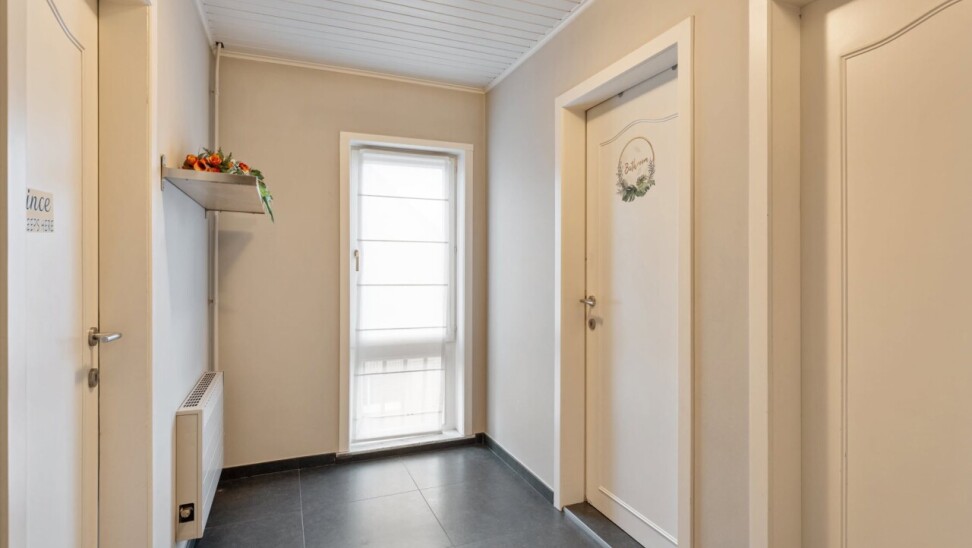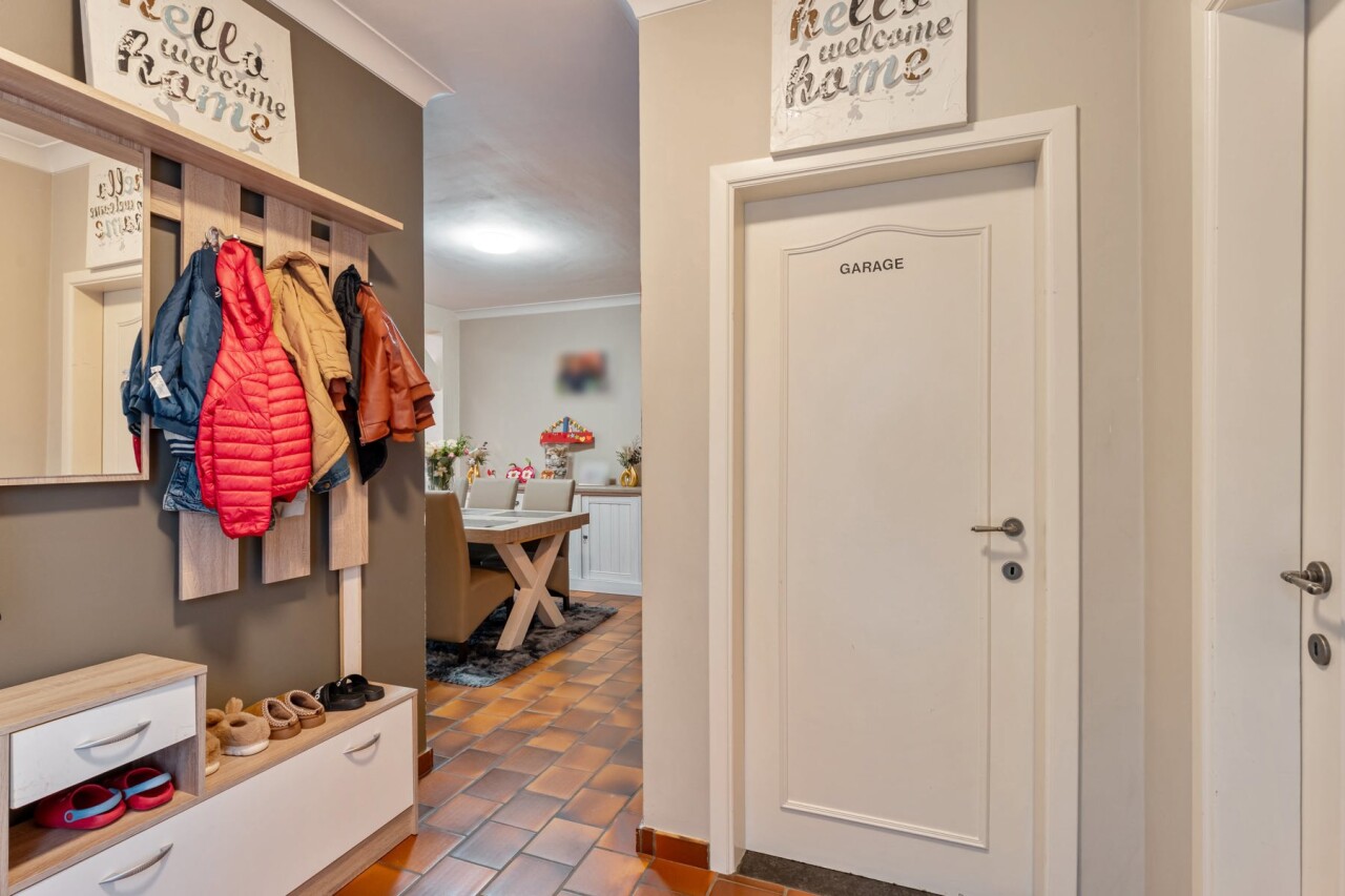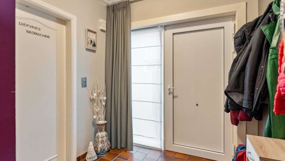 Via de zijdeur betreden we de woning in de inkomhal. Van hieruit is er toegang naar de berging en inpandige garage, dewelke zich langs de straatkant bevinden.