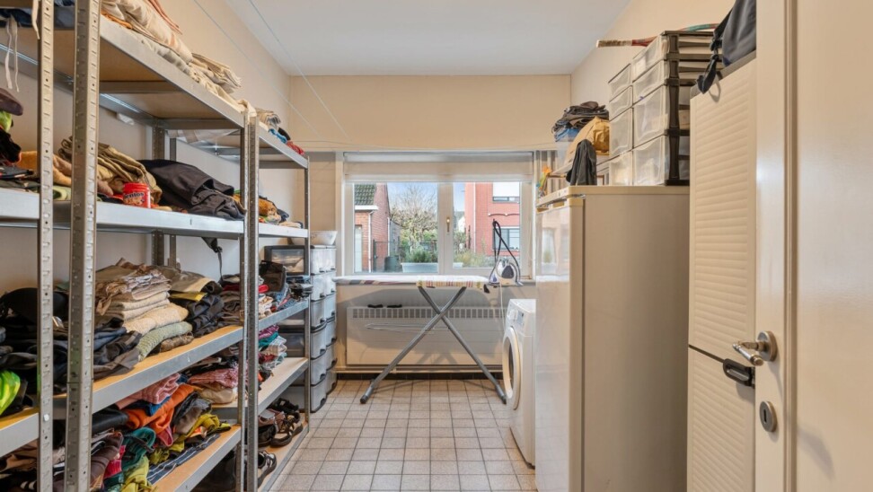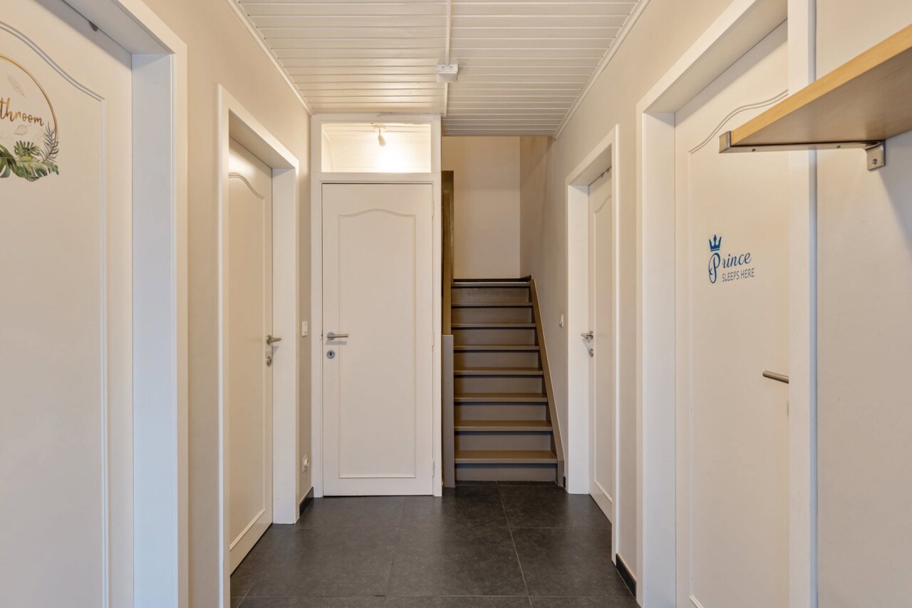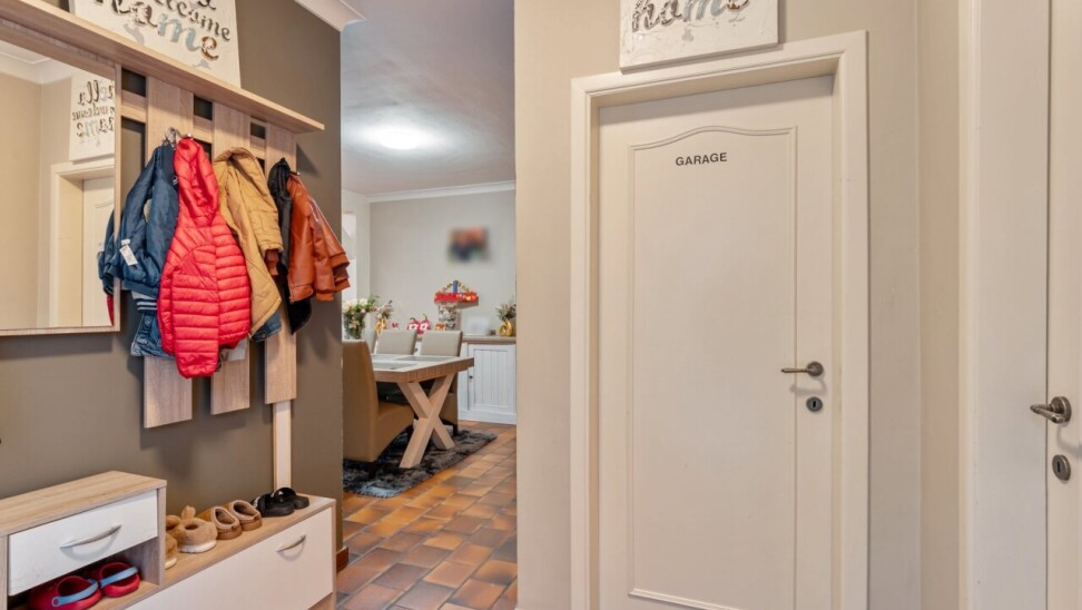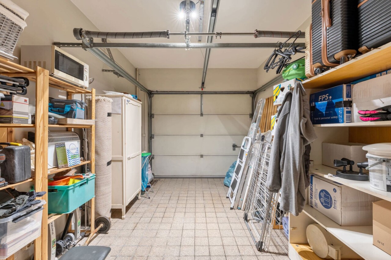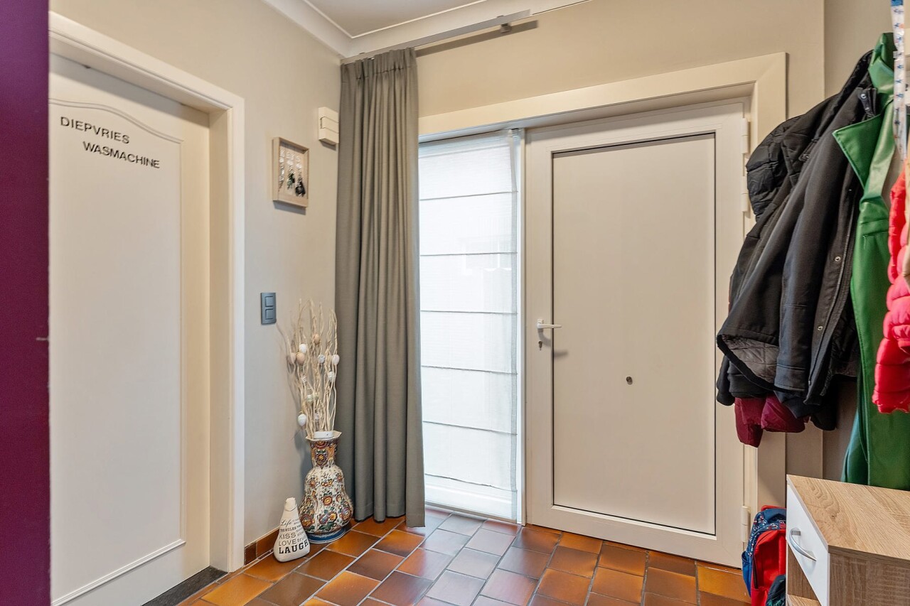 Via de zijdeur betreden we de woning in de inkomhal. Van hieruit is er toegang naar de berging en inpandige garage, dewelke zich langs de straatkant bevinden.