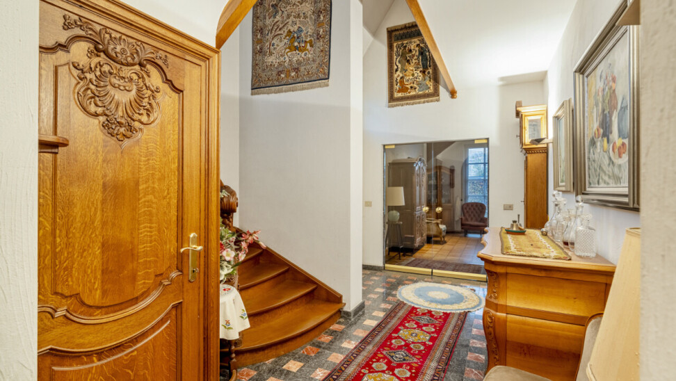 Men betreedt de woning via de ruime inkomhal met gastentoilet en houten trap. Links bevindt zich de glazen deur die toegang verleent tot de zitkamer op volle parket met sierhaard. Aansluitend is er de eetkamer die verbonden is met zowel de leefveranda als de ruime keuken. De keuken is uitgevoerd in volle eik en beschikt over de nodige toestellen. Deze werd steeds goed onderhouden.