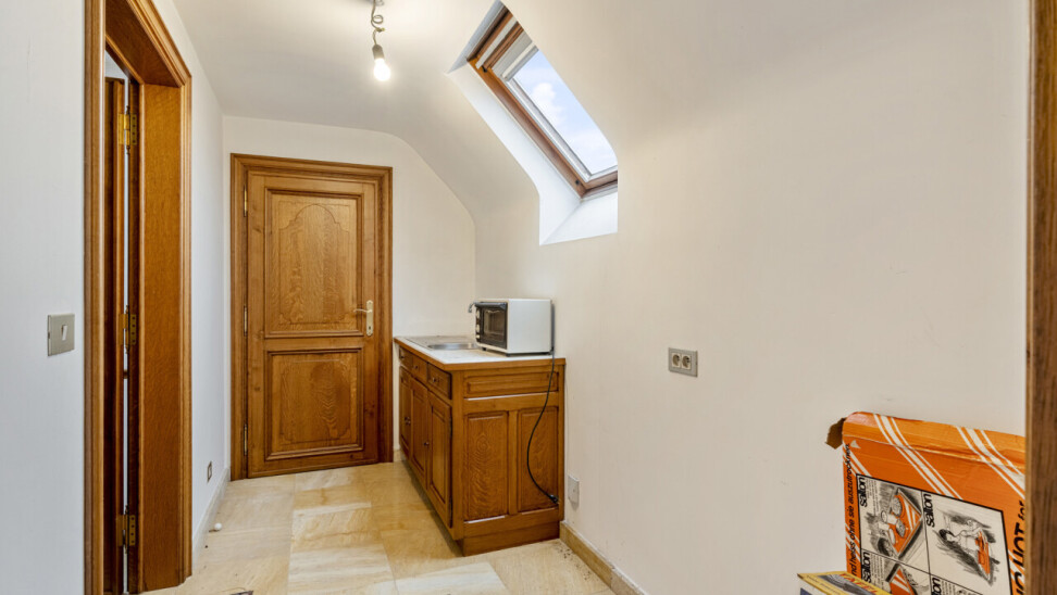 De eerste verdieping van de linkervleugel beschikt bovendien over een zolderkamer, kitchenette met aansluitend toilet en een ruime polyvalente ruimte. Momenteel is deze ingericht als atelier, maar ze kan perfect dienen als bv. leefruimte.