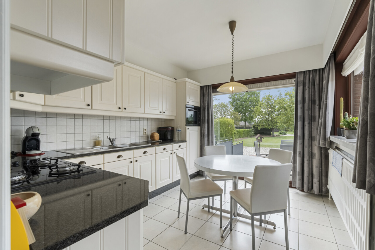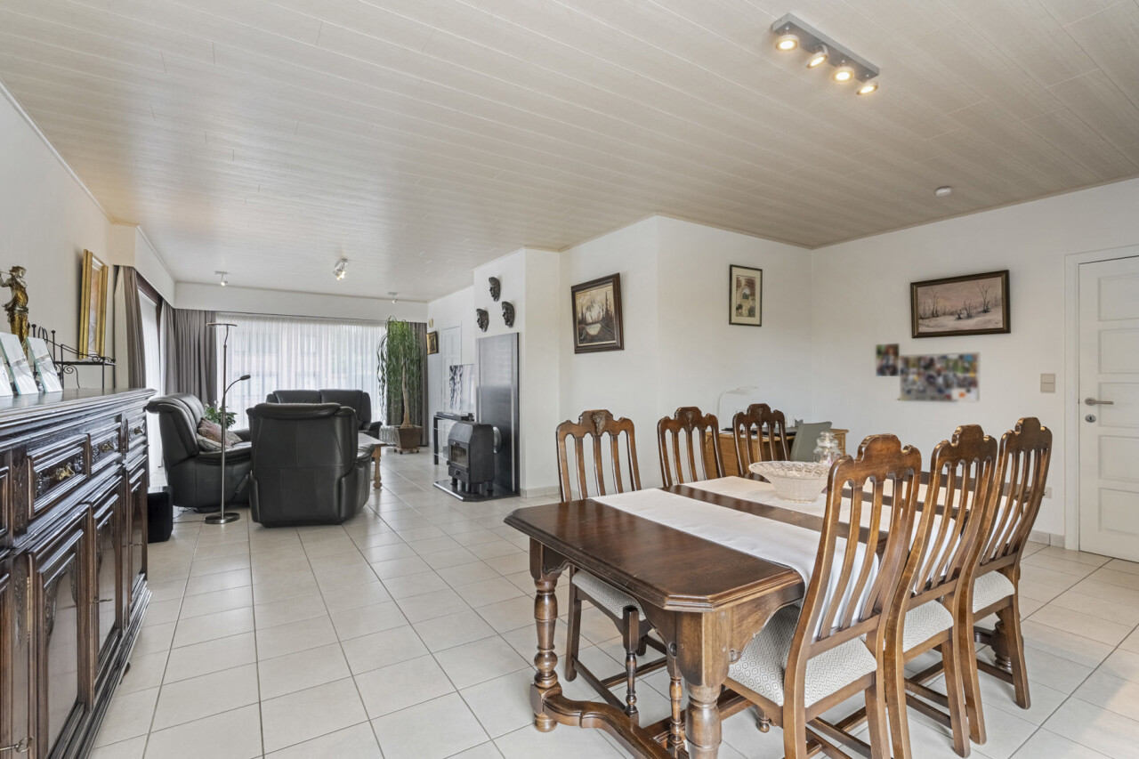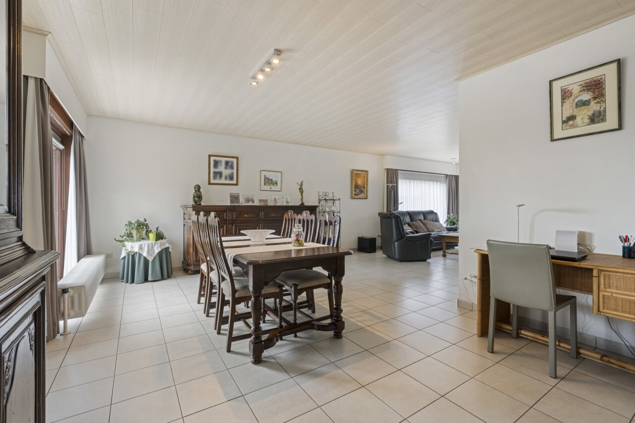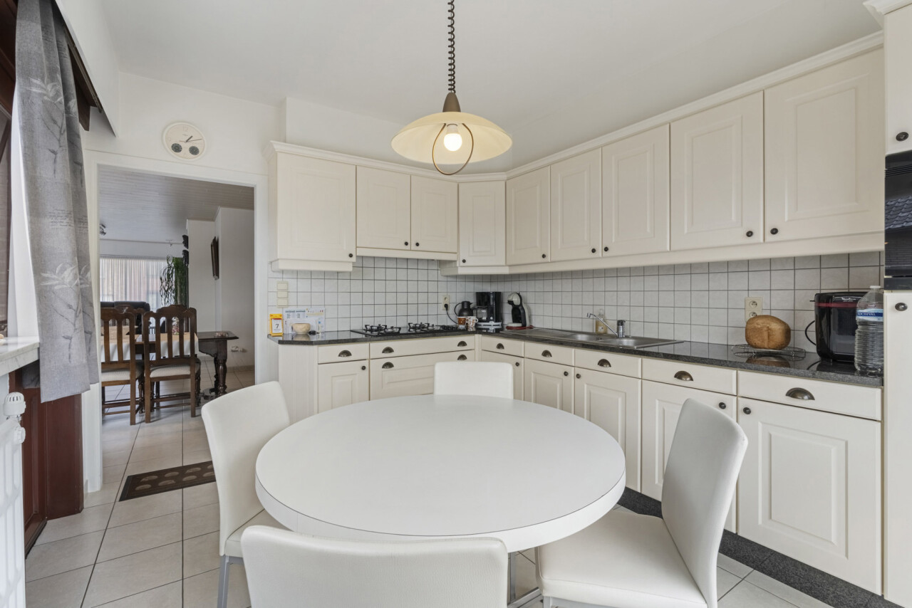 We betreden de woning via de inkomhal met gastentoilet. Deze verleent toegang naar de lichtrijke woonkamer en sluit vervolgens aan op de volledig uitgeruste keuken, voorzien van een combi-oven, gasvuur, koelkast, dampkap, spoelbak en voldoende kastruimte. Vanuit de keuken is er zicht over de prachtige tuin en kan je rechtstreeks naar het terras met zonneluifel.