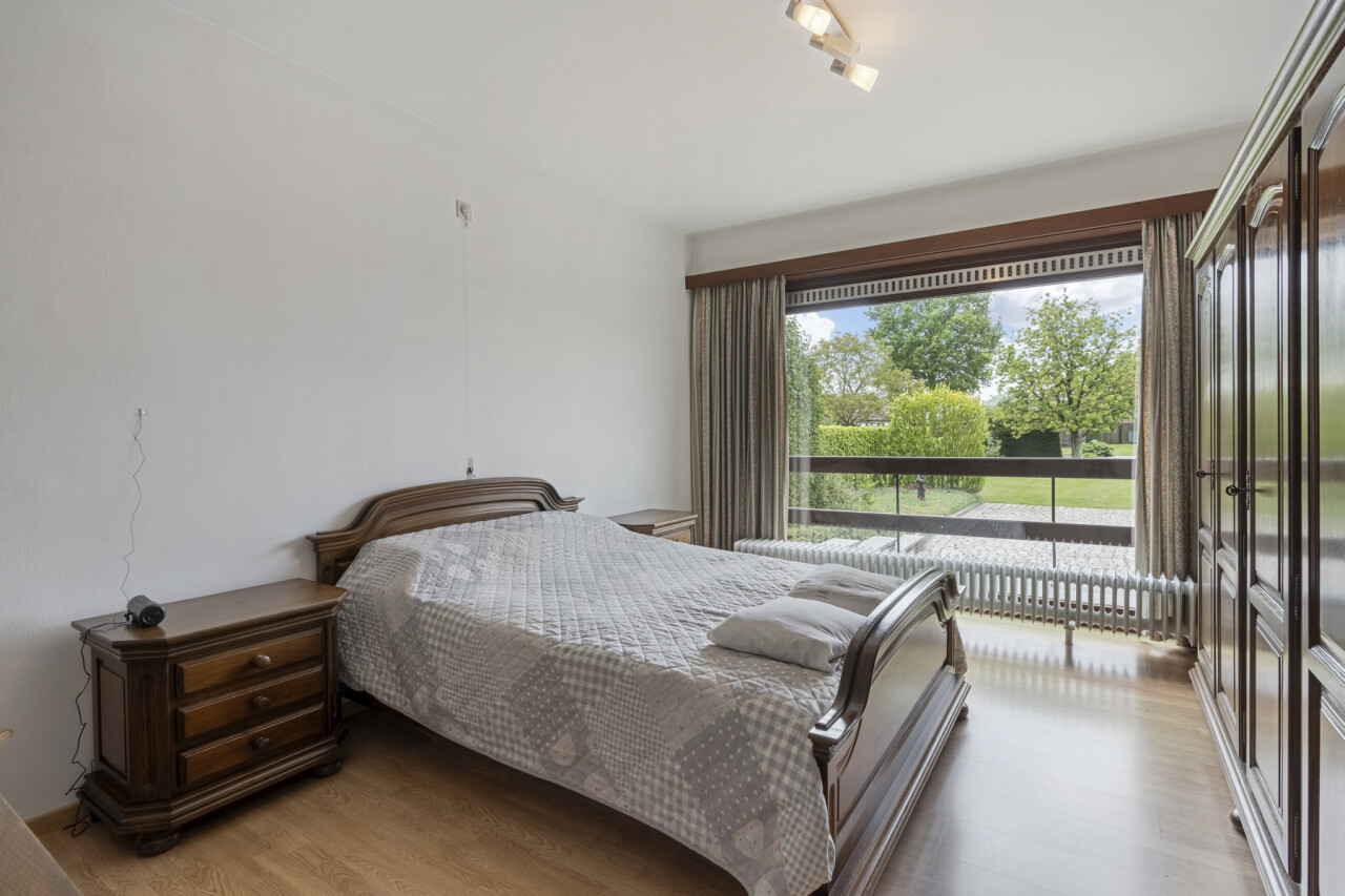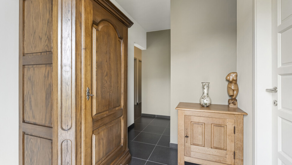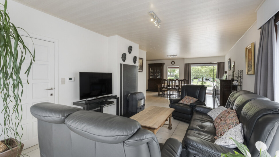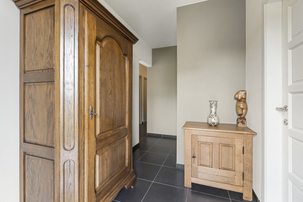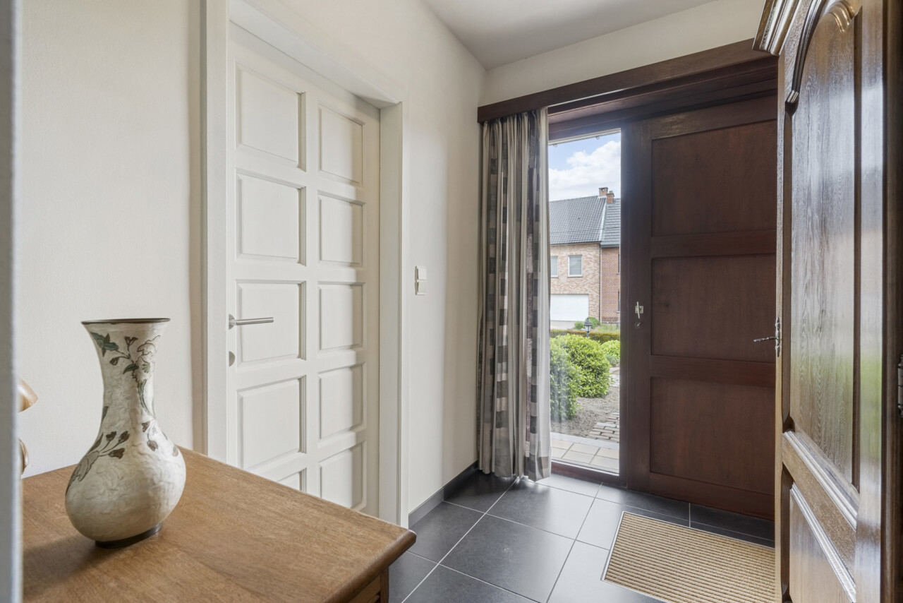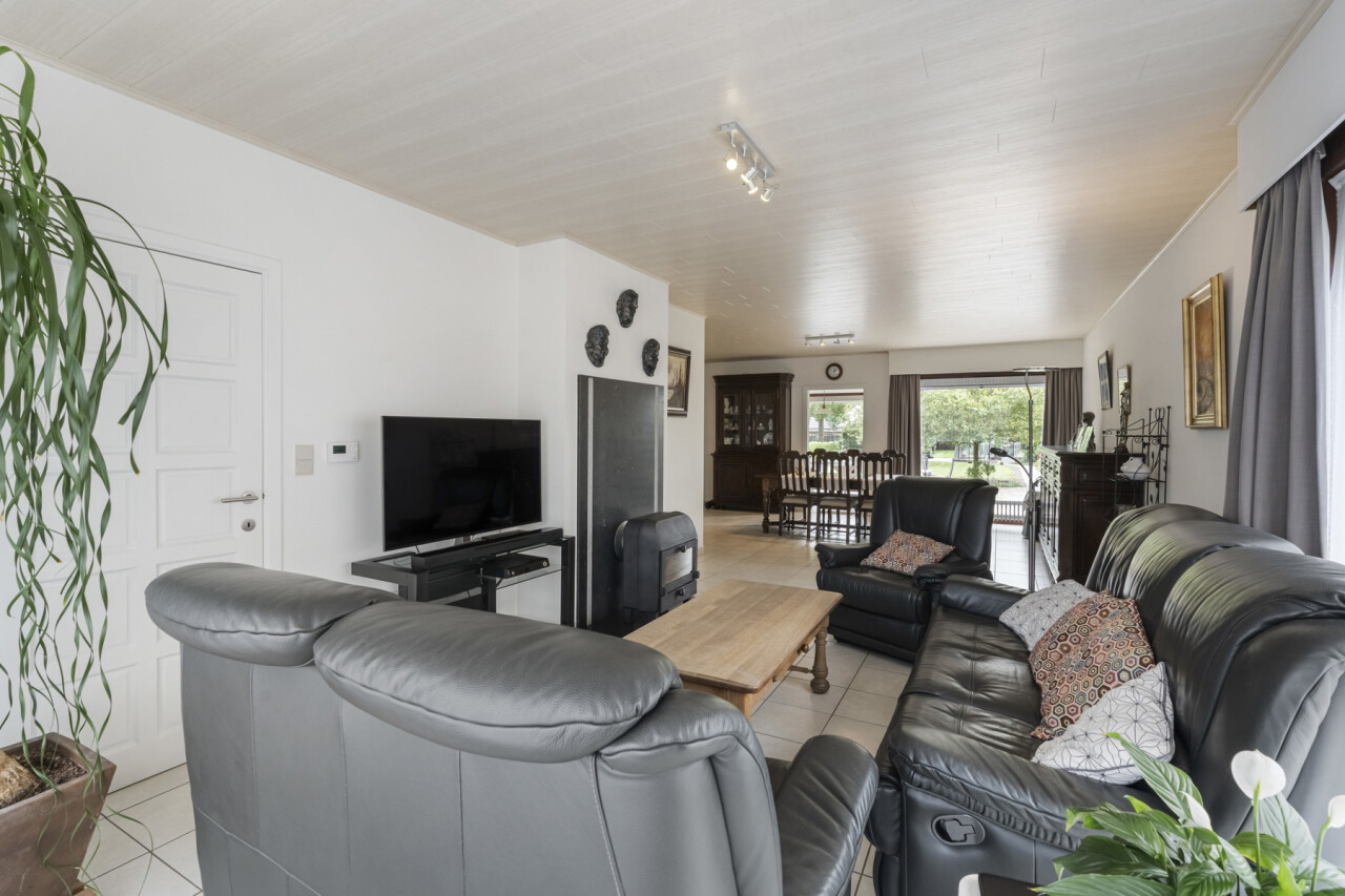 We betreden de woning via de inkomhal met gastentoilet. Deze verleent toegang naar de lichtrijke woonkamer en sluit vervolgens aan op de volledig uitgeruste keuken, voorzien van een combi-oven, gasvuur, koelkast, dampkap, spoelbak en voldoende kastruimte. Vanuit de keuken is er zicht over de prachtige tuin en kan je rechtstreeks naar het terras met zonneluifel.