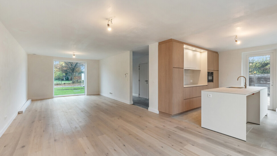 Op het gelijkvloers kom je binnen via een ruime inkomhal met gastentoilet. De lichtrijke leefruimte met warme parketvloer biedt een mooi zicht op de tuin en sluit naadloos aan op de hoogwaardig afgewerkte open keuken met kookeiland, combi-oven, inductiekookplaat, vaatwasser en ingebouwde koelkast. Verder vind je op deze verdieping een praktische technische berging met aansluiting voor wasmachine én een ruime, volledig afgewerkte garage met sectionale poort.
